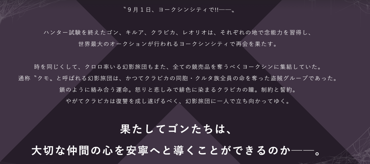 通常舞台劇都以原作的故事片段進行改編,透過真人舞台的演出來展現跟動畫裡不同的效果。而這次劇情則次延續第一彈舞台劇獵人試驗後,主角群四人分別在不同地方習得念能力後,在位於友克鑫市的世界最大拍賣會重逢。這次的重點也放在幻影旅團的對決,帶著復仇之心的酷拉皮卡將正面對上旅團。