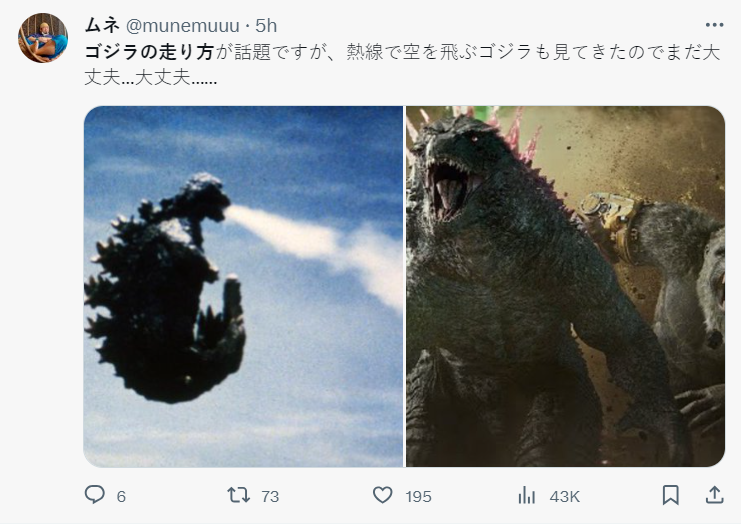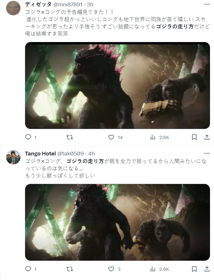 在今日 ( 12/4 ) 清晨公開,傳奇影業「怪獸宇宙」繼《哥吉拉大戰金剛》的續篇《哥吉拉與金剛:新帝國》首支預告,吸引不少海內外怪獸粉絲關注,除了小金剛、紅金剛反派登場外,預告後頭的金剛與哥吉拉奔跑的畫面卻引起關注,日本 X 趨勢上也出現了「哥吉拉的走路方式」( ゴジラの走り方 ),成為網友熱議話題。