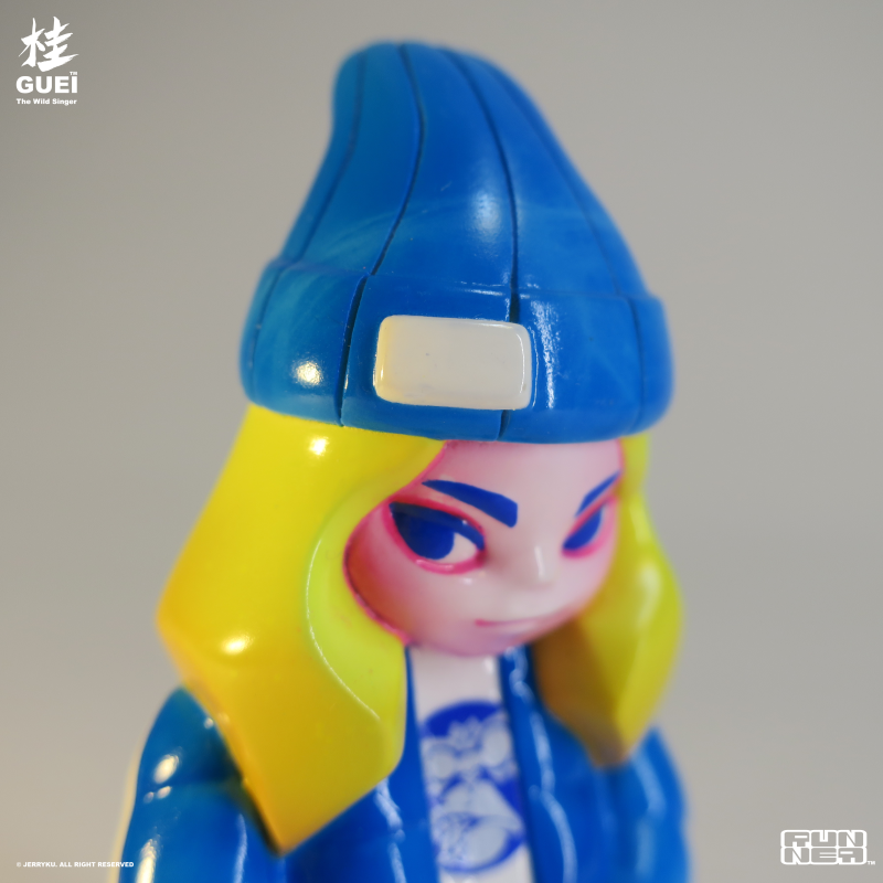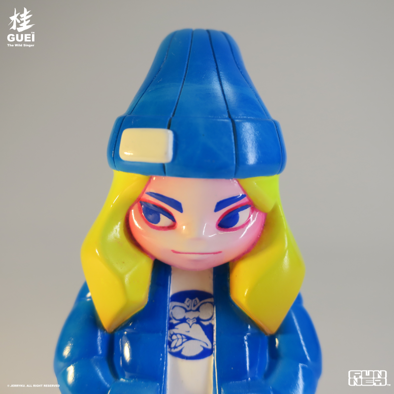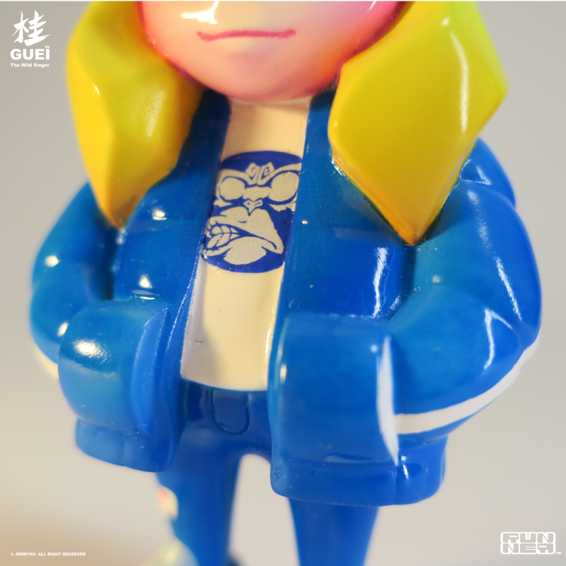 本次在塗裝上採用藍色為主,白色為輔的方式來詮釋主題,藍色部分在星雲紋的方式塗裝後,大大提升了表面細節和玩賞度,長髮部分以漸層黃色來對比服裝,進而提升頭部的聚焦,臉部以螢光粉紅施展妝容,大面積的修容式腮紅讓人感受一股來自80年代的風潮,胸口水貼更是進一步強化角色設定,水貼圖案為「桂」的代表動物-「三眼猿(暫)」,腳的部分則以Fake painted方式將球鞋偽裝成台灣符號-藍白拖,不但呼應主題也傳達出設計師的幽默。