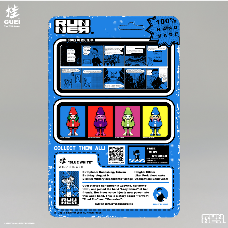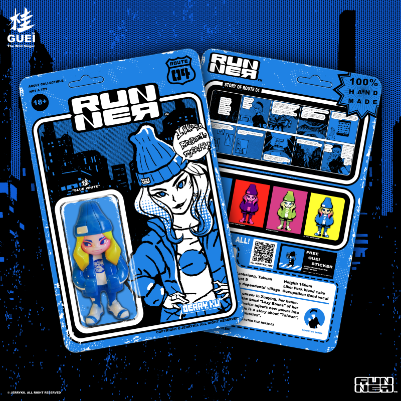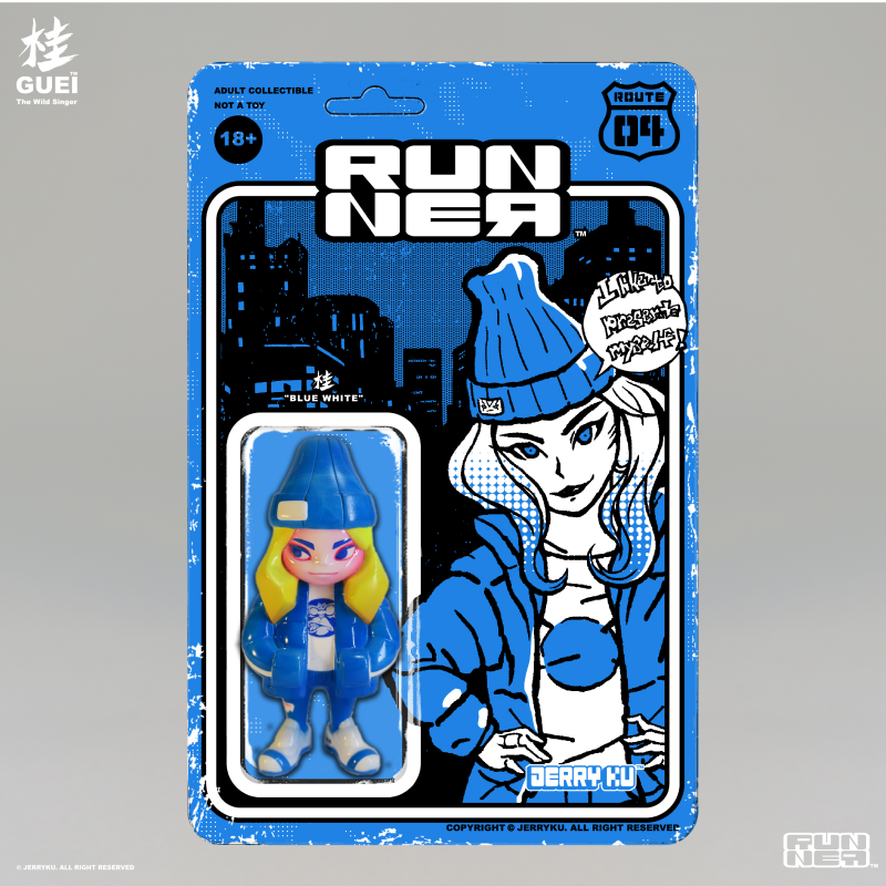 大家好,我是Jerry,我喜歡繪畫,也喜歡創作玩具。今天要跟大家介紹的是我的原創角色玩具──「RUNNER-桂」吊卡最新配色「藍白」。