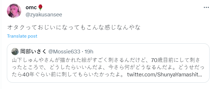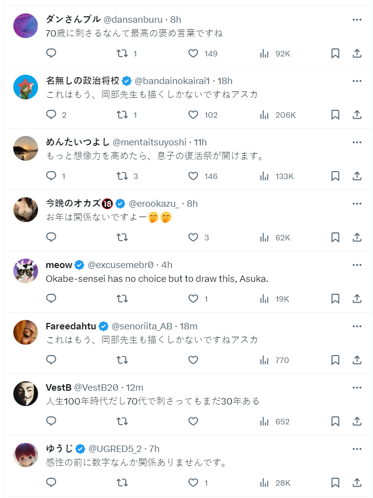 當然這樣的表達是因為年齡的關係,好像沒辦法像年輕一樣放肆揮灑自己的心情,對此不少網友回應 : 「連 70 歲的都能感到心動就是最高的讚美了。」、「這跟年紀沒關係。」, 岡部いさく也表示很喜歡山下俊也的繪畫筆觸,完整的把角色的魅力從平面展現出來。