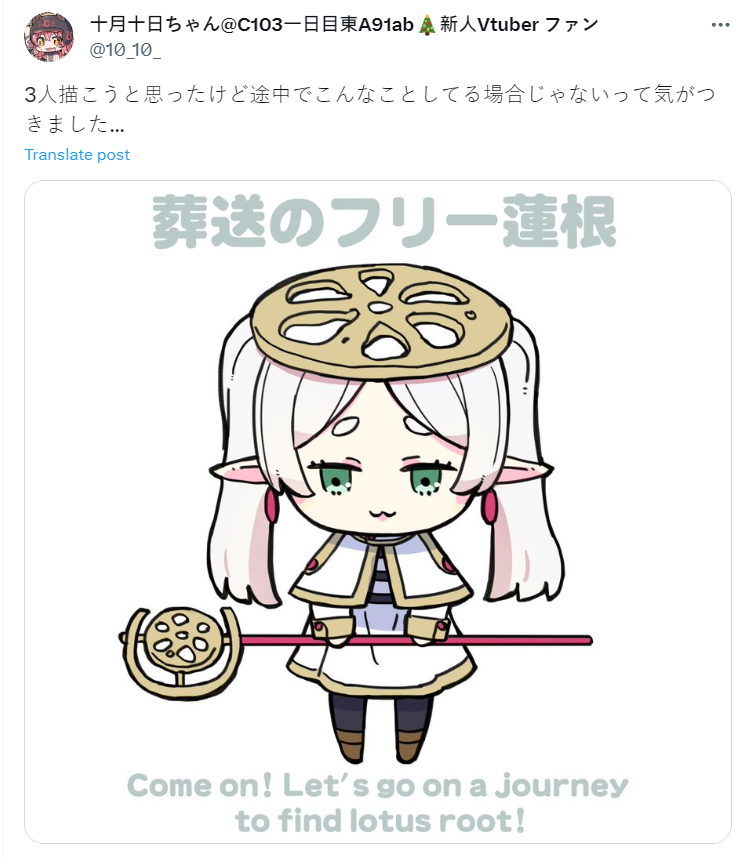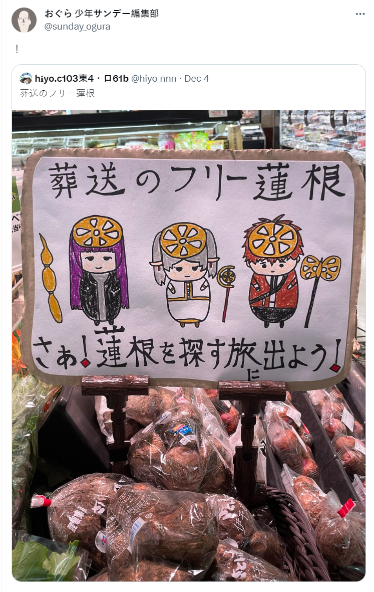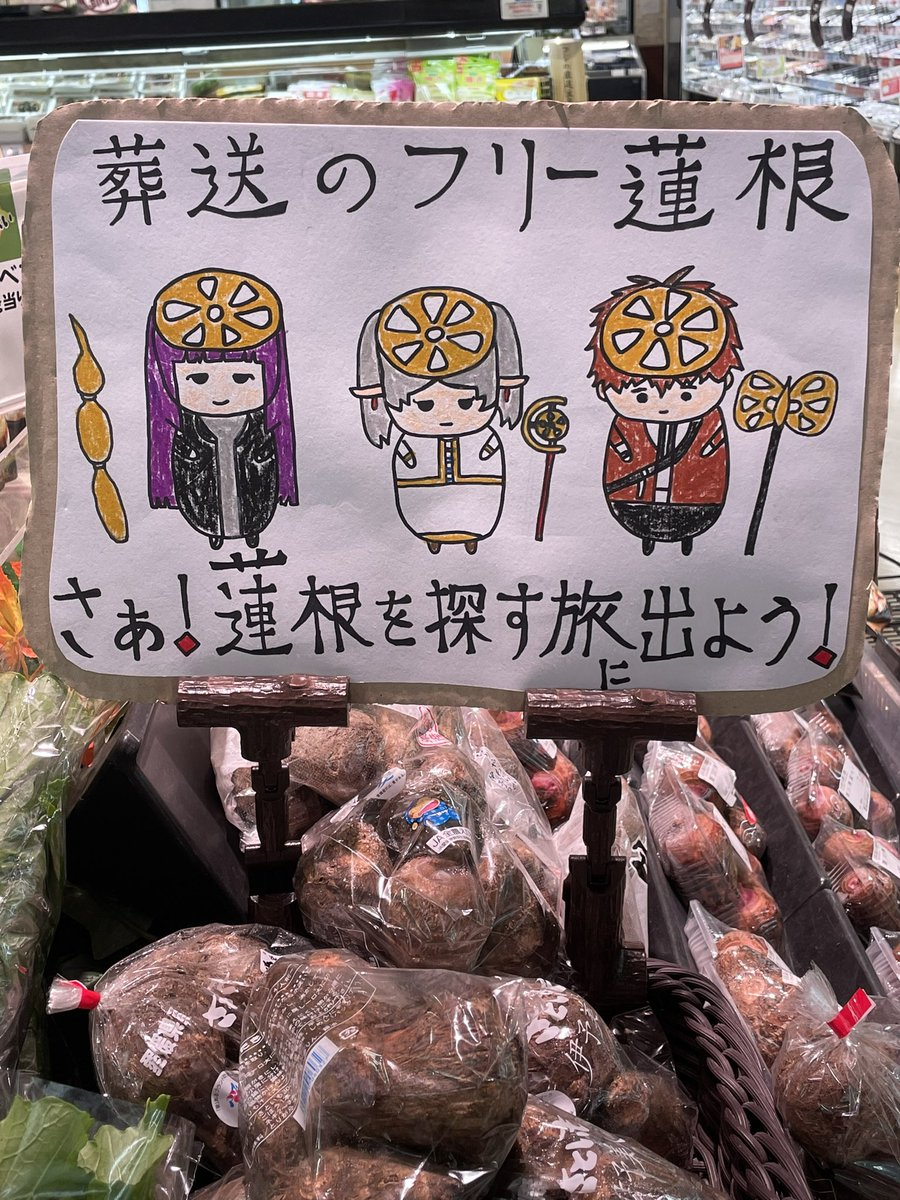 最近在日本 X 上有推主分享,在附近的超市裡頭,驚見他們自繪的「葬送的芙莉『蓮藕』」看板,還畫上可愛的三人組搭配蓮藕的插圖,超萌可愛的看板吸引不少網友大表讚賞其創意。