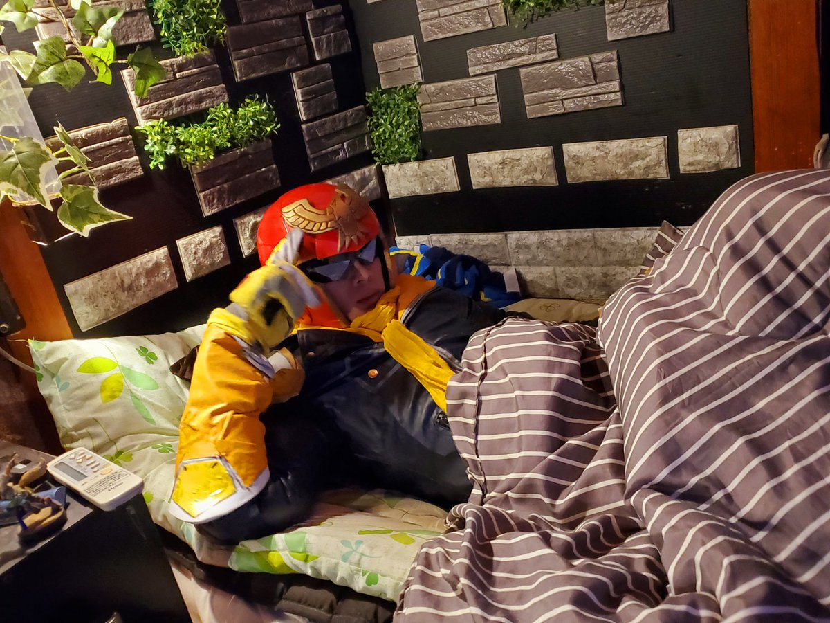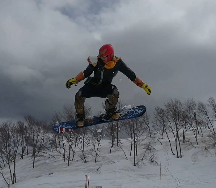 這次雖然沒用上他長見「巧拼」來製作服裝道具,但他仍製作簡單的裝飾配件點綴,讓飛隼隊長的元素能簡單被認出,加上招牌的墨鏡與安全帽造型,再搭配一個黃色圍巾,整個氣氛都不一樣了。バァドゥ自己對這造型非常自豪,認為滑雪穿這套有種神力加持感 XD。