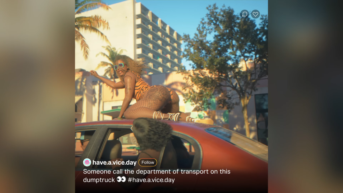 其實這是源自於2017年的一則新聞,是發生在佛羅里達州邁阿密,也就是《俠盜獵車手6》中「罪惡城市(Vice City)」的原型城鎮,當時一名身穿清涼服裝的女子,在一輛於高速公路上行駛的汽車車頂上,不斷扭動著身子,以劈腿的姿態大跳電臀舞,不僅一點都不在意旁人的眼光,更無視自己可能陷入致命危險的危機。