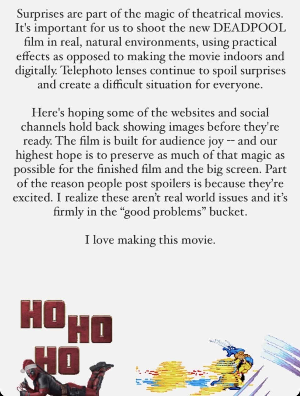 雷諾斯接著寫道:「我們希望某些網站和社群頁面別在我們完成之前就貼出那些照片,這部片是為娛樂觀眾而生,我們最大的願望是盡可能替成品和大銀幕體驗保留魔力。人們張貼劇透的其一原因是他們很興奮,我知道這不是多重大的現實議題,也非多難克服的難題,但我很投入拍攝這部電影。」
