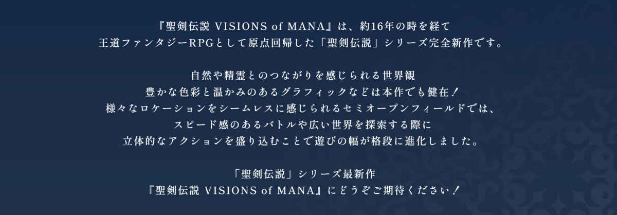 這款官方設定上是自 2006 年《聖劍傳說4》後睽違近 16 年回歸原點的新作,延續過往獨特的自然和精靈緊緊相連的世界觀。加上豐富且溫暖的色彩帶給玩家體驗。也希望相繼多年來的原點新作,可以讓玩家體驗系列進化的遊戲風韻。
