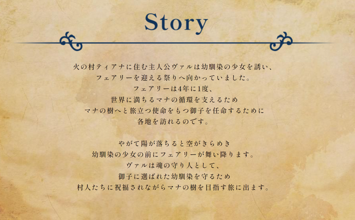 主角瓦爾生活在火之村提亞納,他邀請了自己的青梅竹馬一同前往召喚菲雅莉的祭典。為了讓瑪那能繼續循環於世界,菲雅莉四年一度會拜訪各地,選出新的神子,而被選上的神子將背負著前往瑪那之樹的使命。