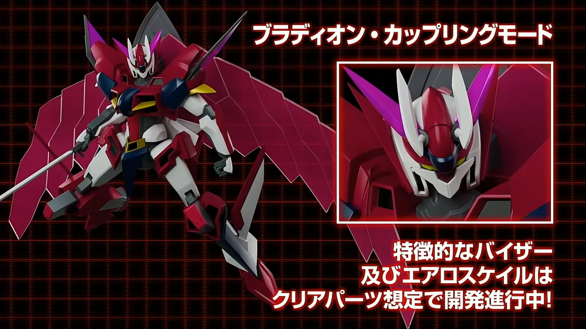 主角青葉的好夥伴、年少的王牌駕駛員迪奧所駕駛的「BRADYON」首度以組裝模型規格商品化!藉由替換頭、肩、腿部零件並裝上背部的騰空鱗翼,就能再現與姐妹機 LUXON 連攜作戰的「聯結模式」狀態!
