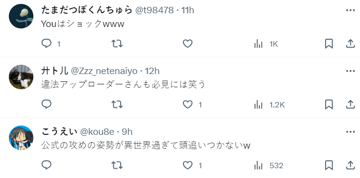 官方聲明如下,表示本次月底公開的「世紀末編」將會有《北斗神拳》拳四郎登場之外,更會在開播前 10 多分鐘於官方 Amazon 商店上開放全篇下載,僅 300 日圓販售。不僅開放各位下載外,更允許違法上傳到 YouTube 與 Niconico 動畫平台,甚至給創作者能直播觀看並開放營利。這樣的作法...真的是完全逆於現行規範,就是請各位自由傳播,也不會追究片源來源。