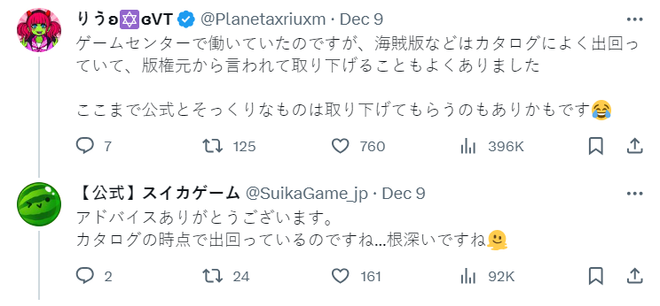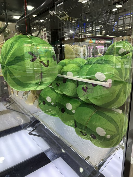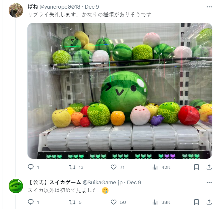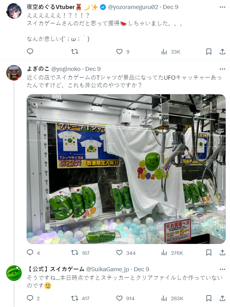 由於遊戲本身的設計有著可愛的水果外觀,這也讓不少業者以此為商機,在日本的遊戲間的夾娃娃機裡,出現了許多相關的娃娃周邊,尤其趁著一波風潮,現在各處都能看到。這也讓《西瓜遊戲》的官方在 X 上發文,表示這些其實跟他們都無關,都是未經官方批准的盜版版本。