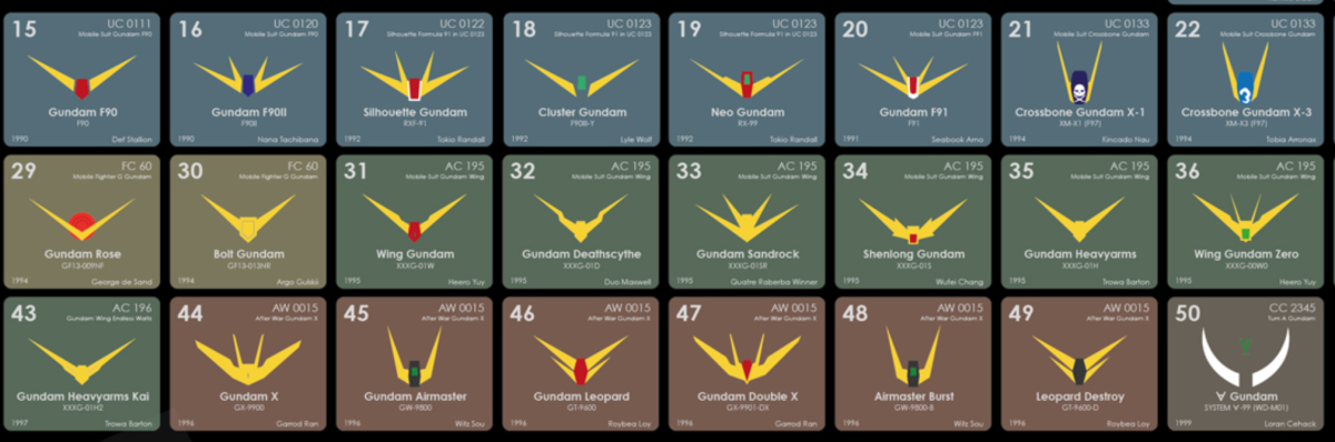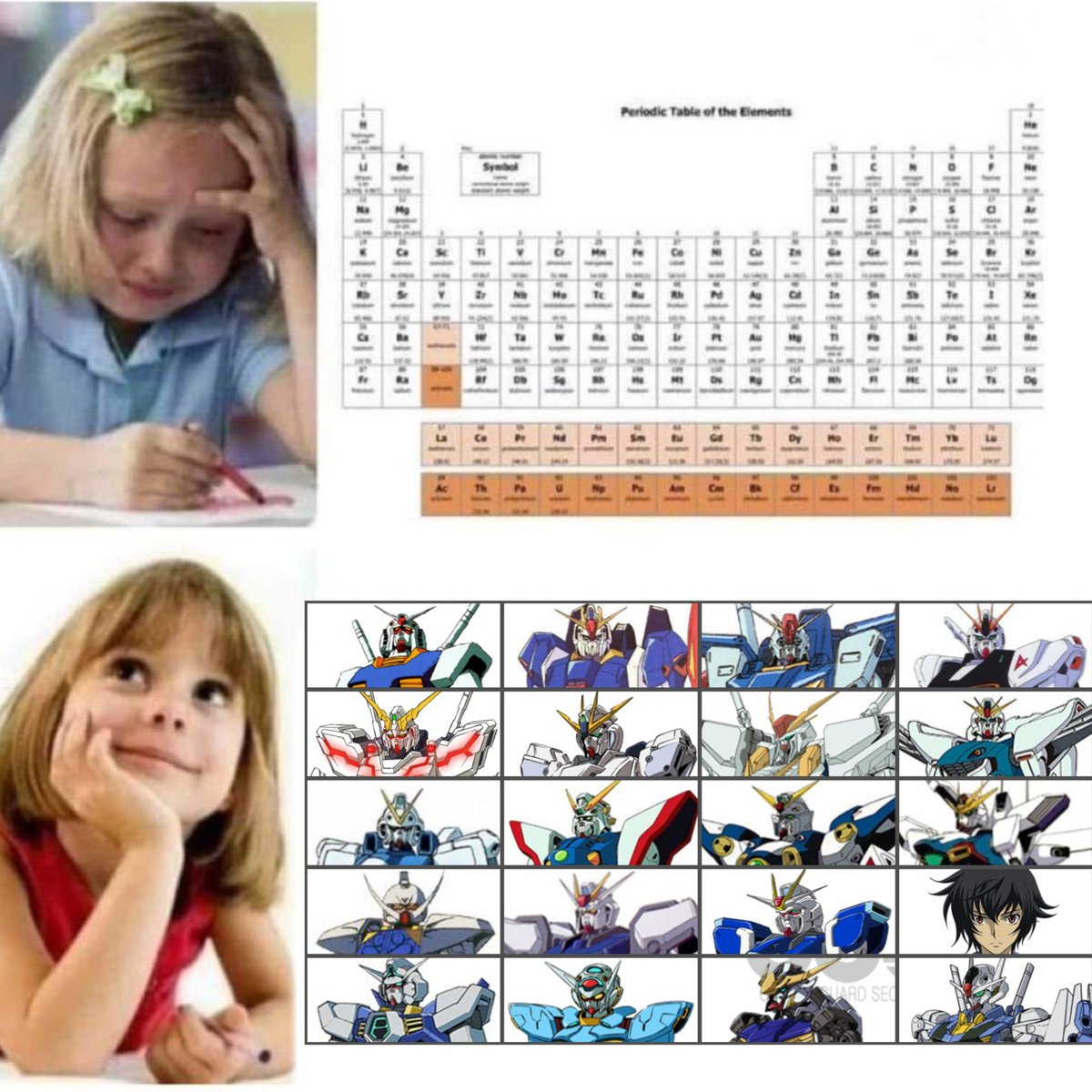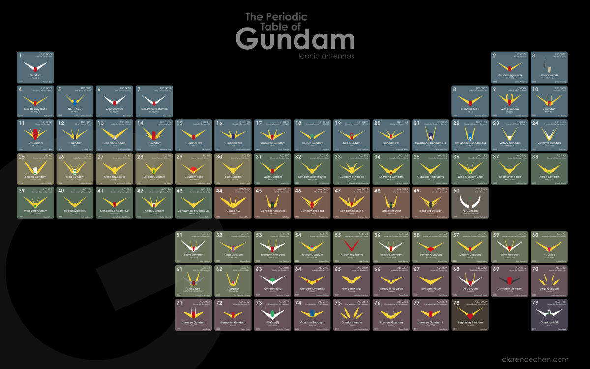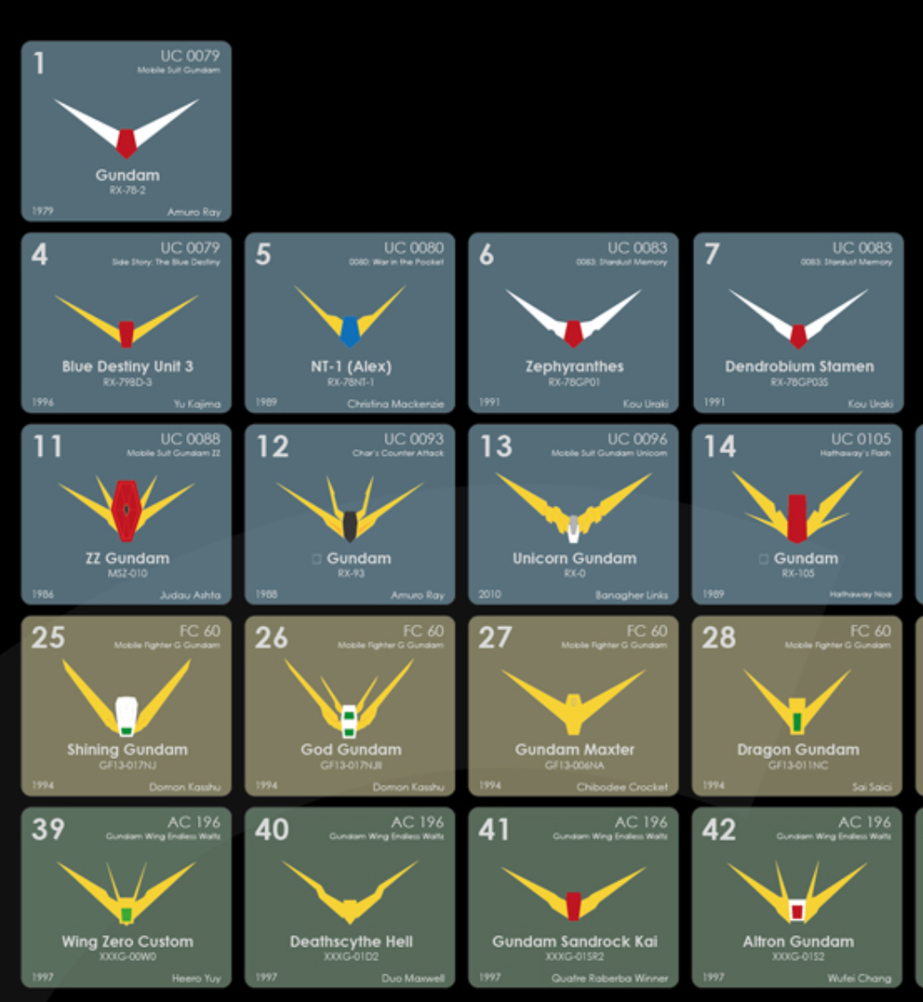 看看推主的舉例,基本上就是把鋼彈肩部以上的圖片放上,或許你各位鋼彈粉看到這樣就可以喊出各種鋼彈的名稱與對應的作品,應該...比起元素週期表簡單吧 ( ? )