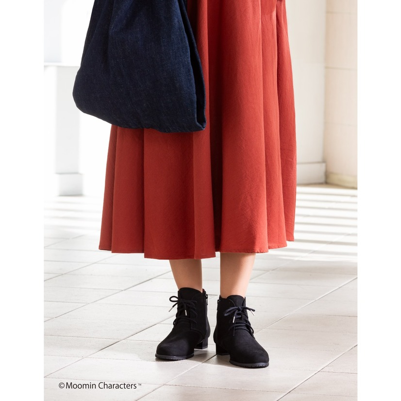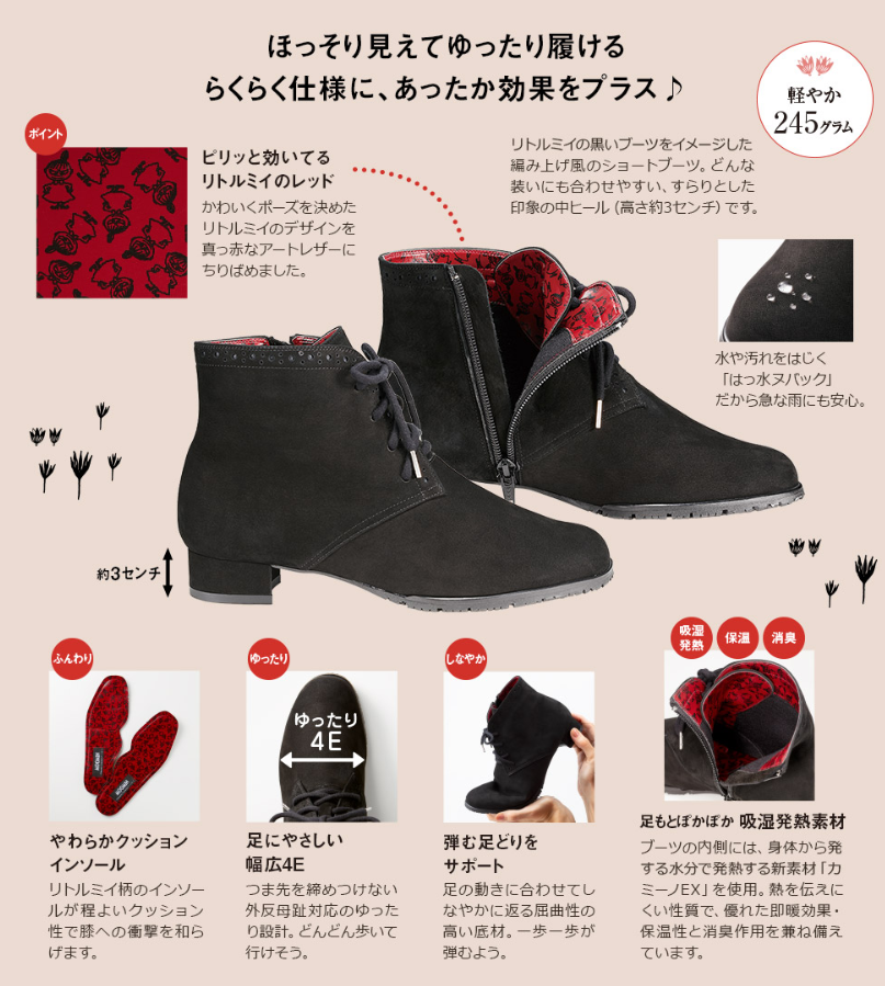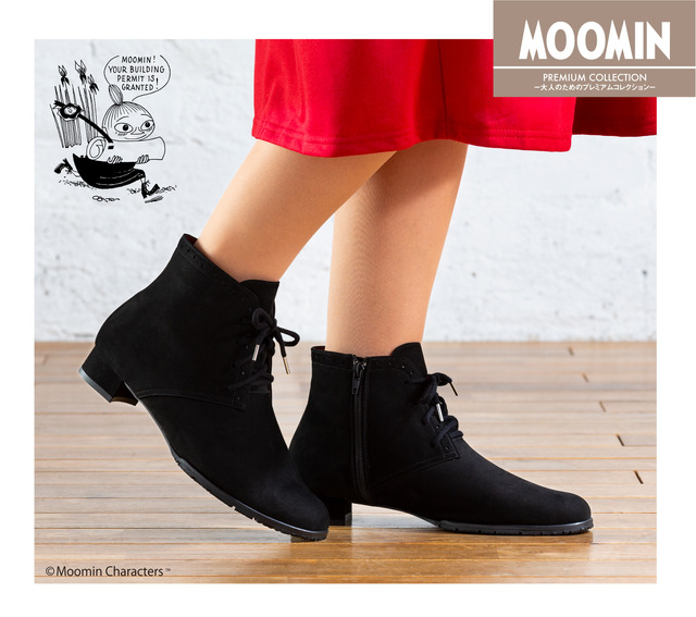 設計上採用小不點 ( Little My ) 在原作中穿著的黑色鞋款,雖說原作看起來比較像是更高筒的靴子,不過這次製作成黑色的短靴靴款,是非常適合秋冬日常生活穿搭的款式,看起來簡單卻也藏有不少細節。