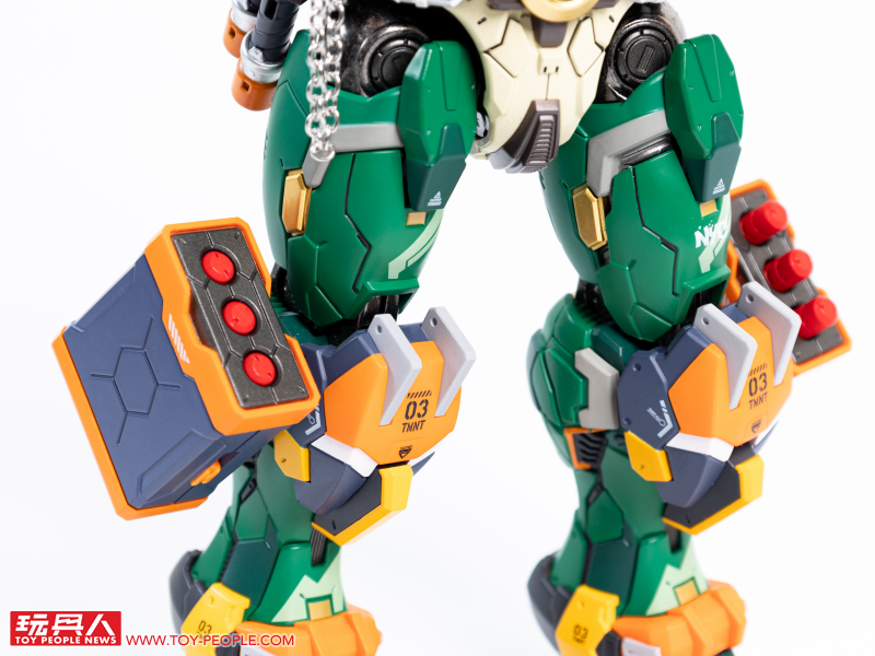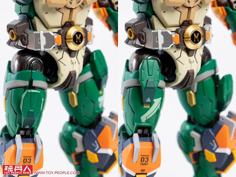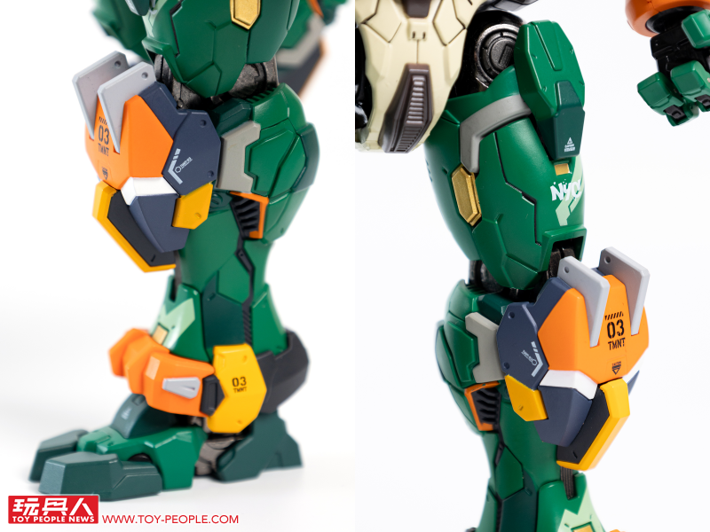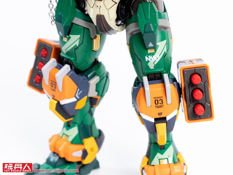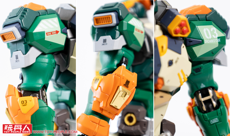 ▼ 接著我們來看看這次米開朗基羅軀體的細節刻畫,伴隨著精密裝甲分割的是對比鮮明且豐富的色彩表現,以橘、綠為主調的搭配中,於胸腹、四肢點綴了沙色與灰色,腰帶與背部分別是金、銀與磨砂質感的深棕色,同時也能在多處看見 03 TMNT 的機體編號,不同於李奧納多的「忍」字,米開朗基羅則是有著 MIKEY、塗鴉風格的 NYC......等裝飾。