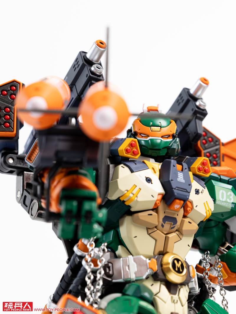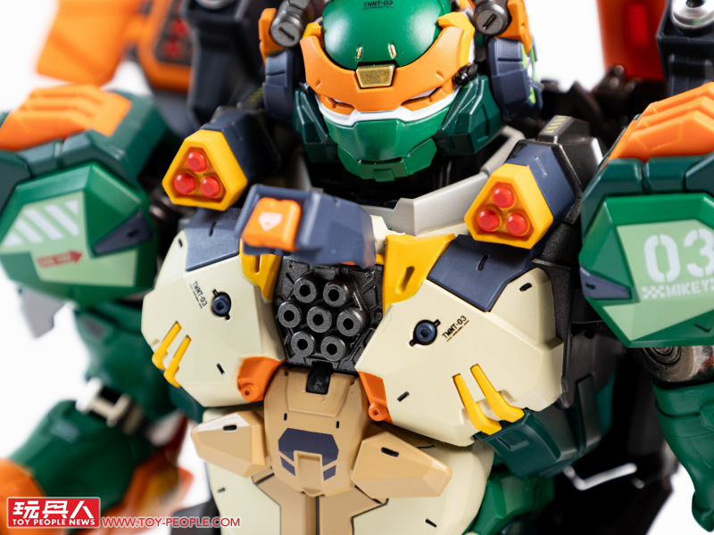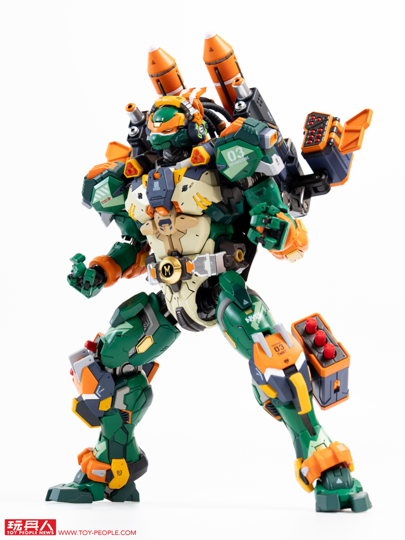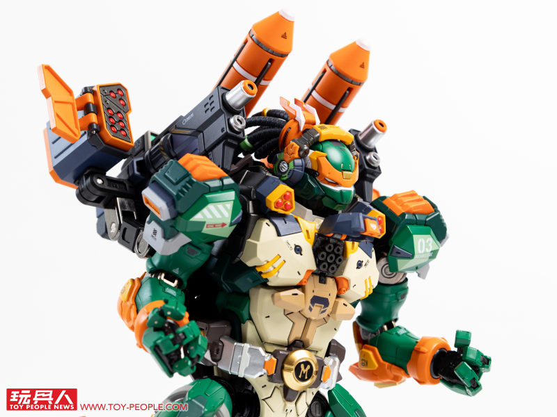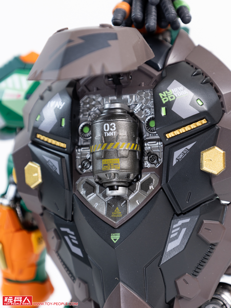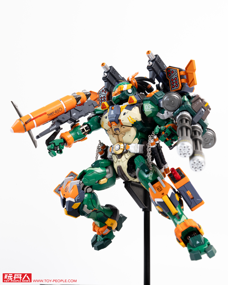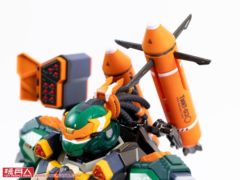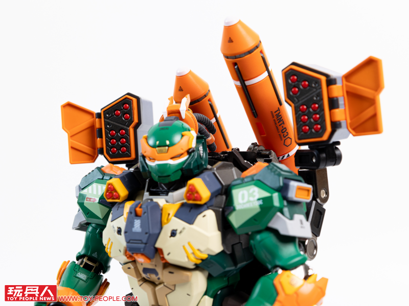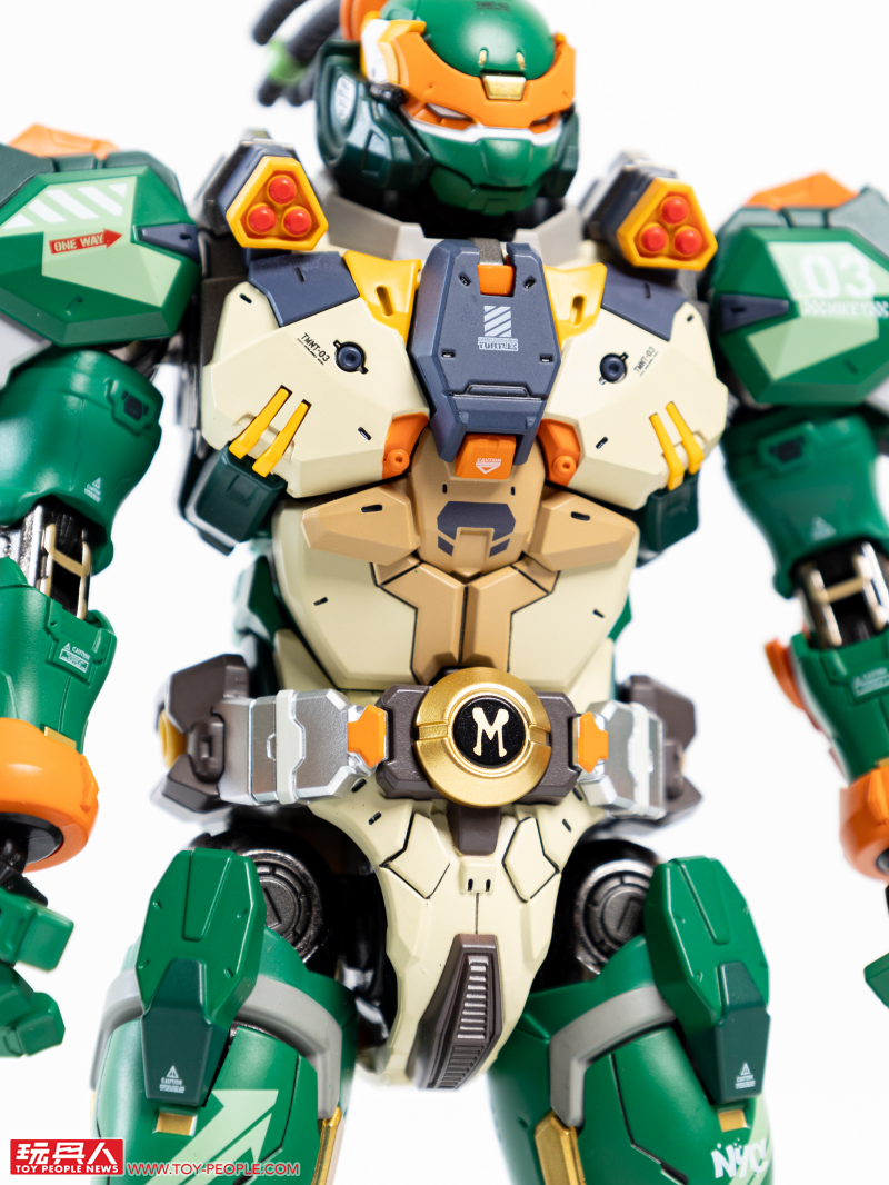 在機甲忍者龜的設定中,TMNT-03 米開朗基羅就是由他本龜駕駛,是負責破壞、摧毀敵方基地的火力擔當,除了有配置雙管格林機槍、高出力加農炮、巡航導彈......等大量的重型武裝之外,能夠將武器全部配掛在身上的設計更是讓他成為移動火藥庫,可以在戰場上給予對手猛烈的火力打擊!