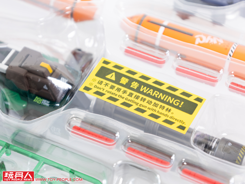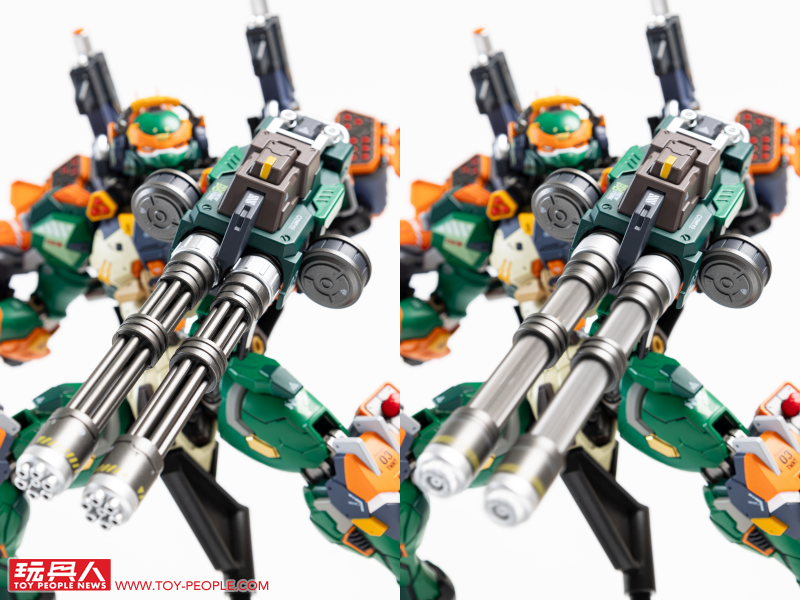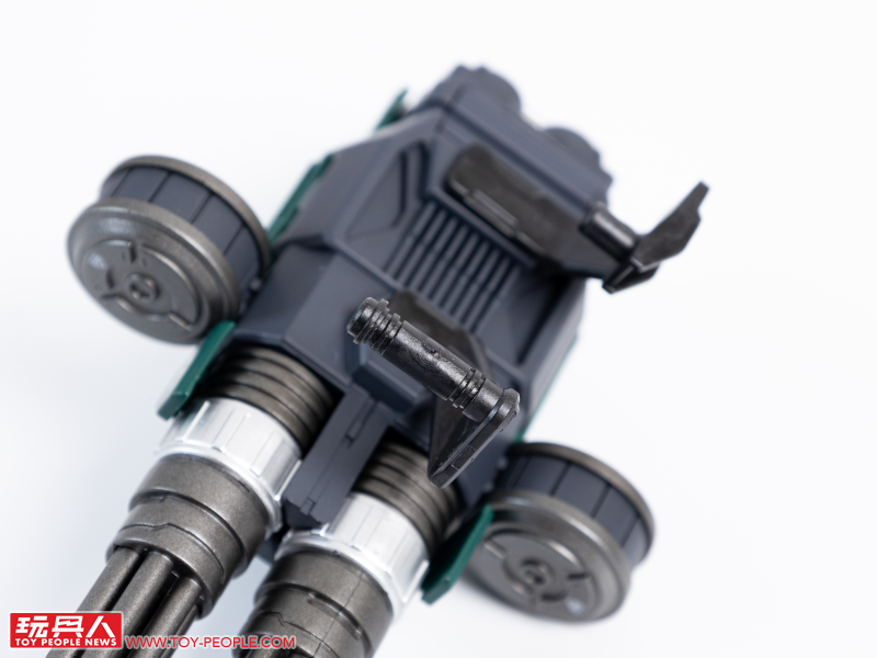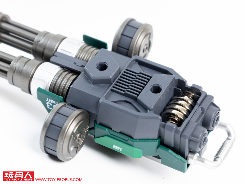 ▼ 再來是另一個讓人期待不已的把玩機構:雙管格林機槍的槍管轉動啦!說明書中表示必須自備 3 顆 LR1130 的鈕扣電池才可啟動,不過小編這裡遇到一個狀況就是電池盒裡的彈簧不夠長,必須用到四顆才能順利啟動的狀況,建議各位玩具人還是多買一顆備著喔。