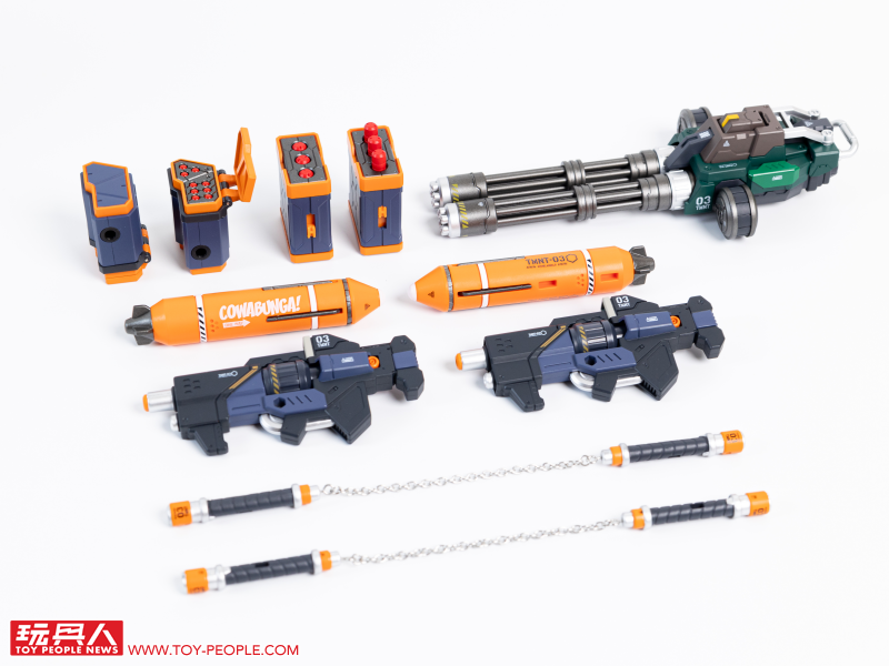 看完了米開朗基羅本體與龜殼,再來就是另外一個重頭戲「武器」的部分啦~下圖由左至右、從上到下分別是肩部誘導式導彈發射器×2、腿式導彈發射器×2、雙管格林機槍、巨型巡航導彈×2、高出力加農炮×2、雙節棍×2。