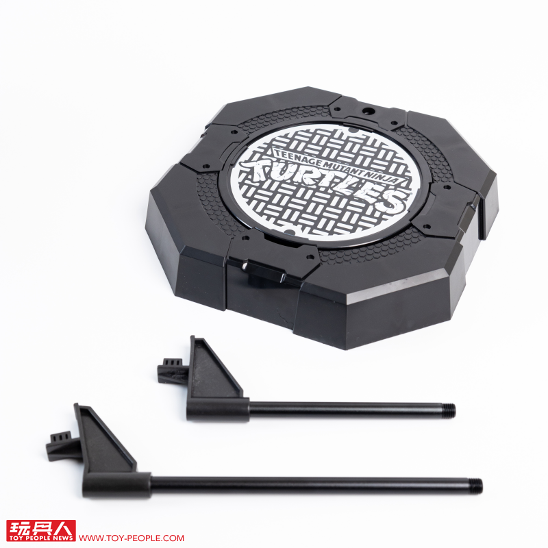 ▼ 底座與李奧納多採用相同的設計,中間銀色部分是經典的《忍者龜》地下水道孔蓋樣式的 LOGO,其餘部分則是素黑色的塑膠,中間的孔蓋可以掀開、放一些沒用到的連接件,另外還有附上一長一短的支架與兩個幅度不同的支架連接件。