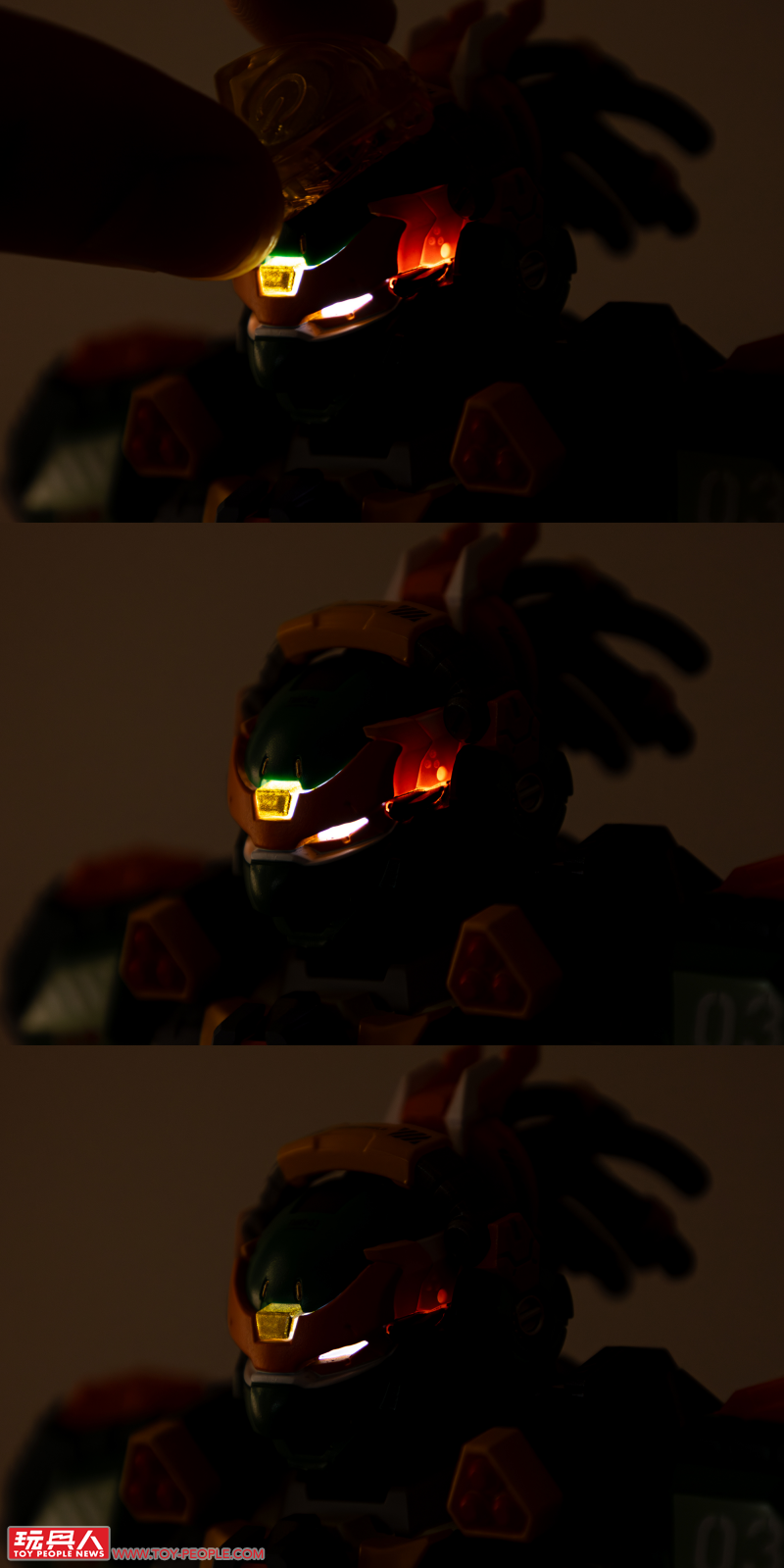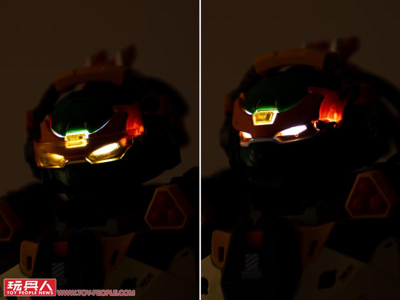 最後,就是這次米開朗基羅額外的把玩性,拿出配件內容當中的機械披薩當作開關吧!首先是上次李奧納多也有的雙眼發光功能,必須自備兩個 LR621 型號的鈕扣電池才可啟動!點亮之後可說是擁有畫龍點睛的效果,來看看有無戴上護目鏡的樣子吧!