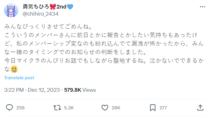 勇氣千尋在官宣後也隨後發文,表示自己原本想在前幾天的會限跟大家先行報告,但擔憂資訊外流出去造成不必要的混亂,決定還是由官方公告來知會大家。