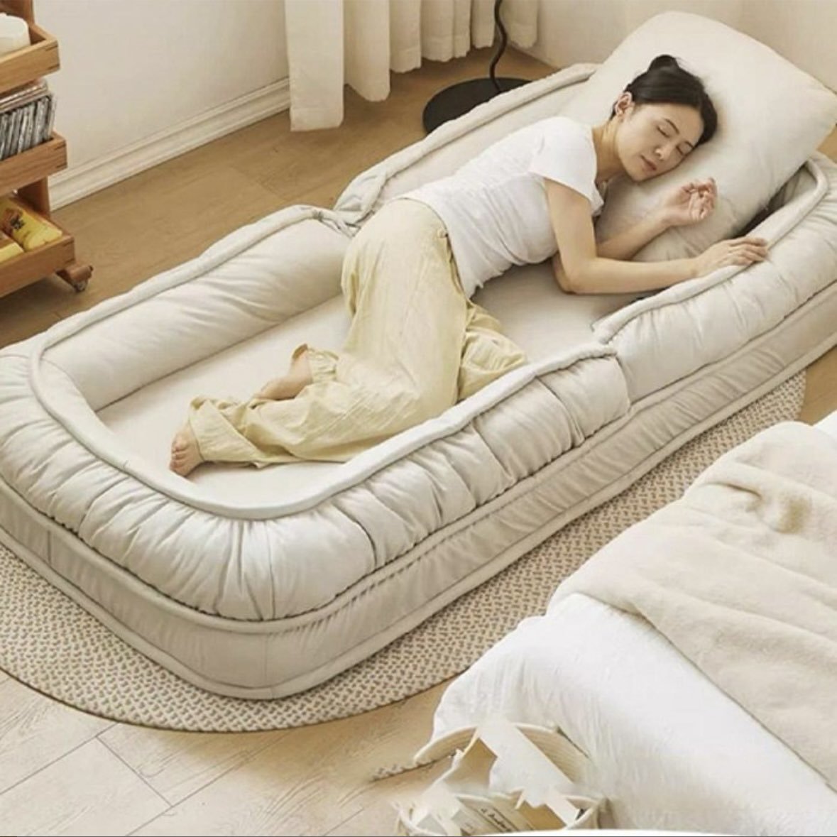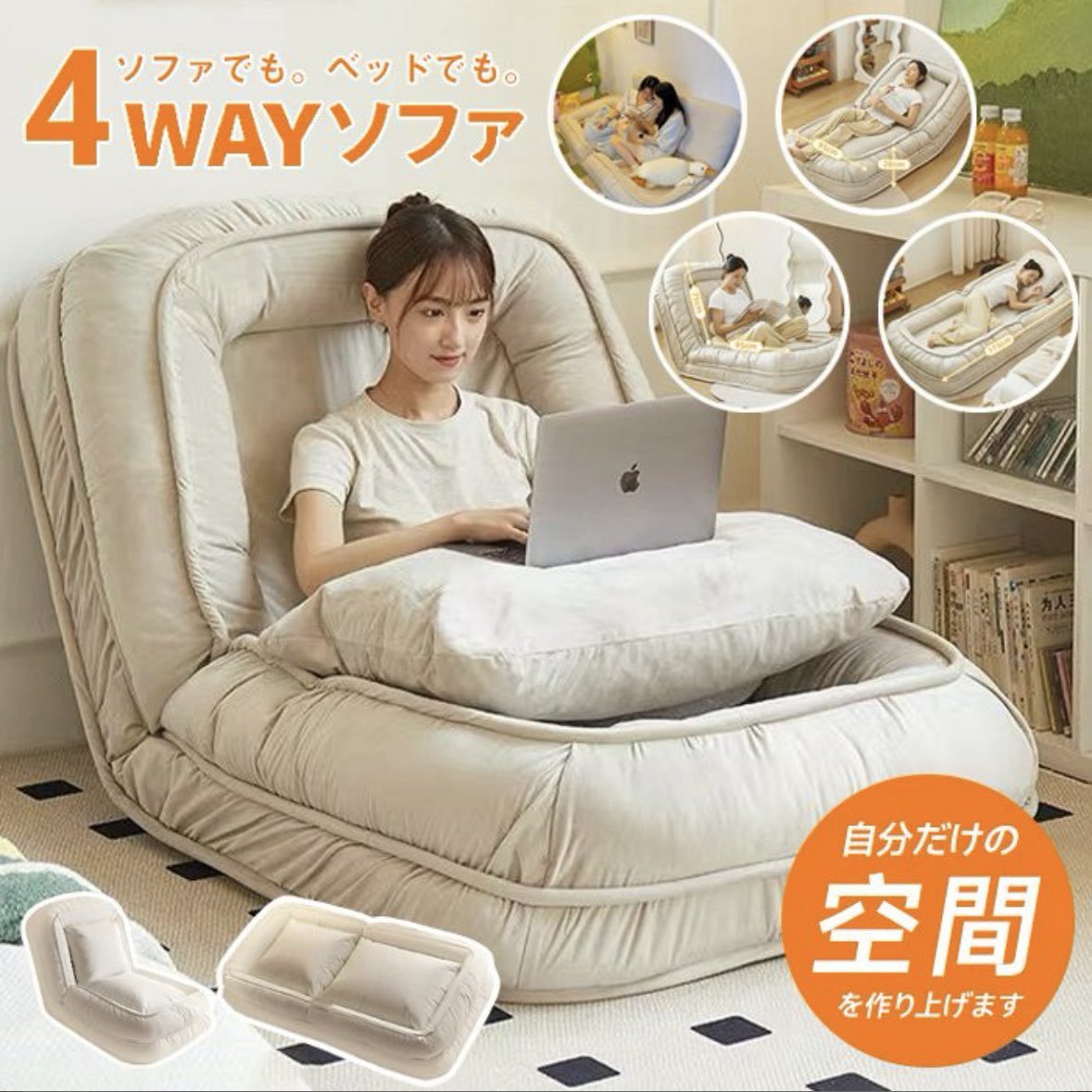 這是由網友N(@n_0530_)在Twitter(現稱X)上所分享的沙發床產品,從圖片中可以看到,這組沙發不僅能夠摺疊成L型,好讓使用者可以坐在上面閱讀或是玩遊戲,也能夠攤平成180度,用你最舒服或是最醜的姿勢,躺在上面好好休息,享受一個廢到極致的生活。
