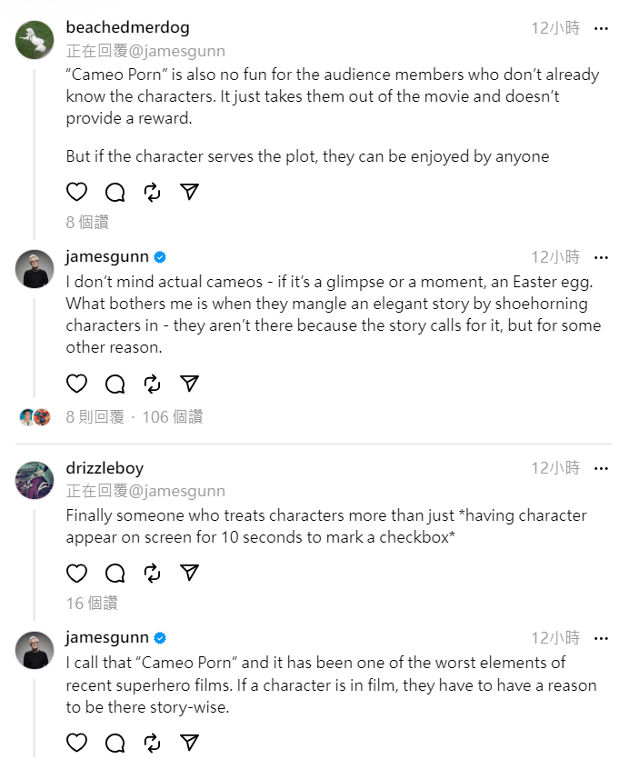 岡恩隨後則補充:「Cameo Porn 是近期超級英雄電影最糟糕的其一元素。如果角色出現在電影裡,那它就得有敘事上的存在價值。」在同串留言區中,岡恩也重申,由他編導的《超人:傳承》(Superman:Legacy)雖然看起來角色眾多,但除了超人以外的所有配角都不是客串,也絕不會搶走超人故事主線的焦點,岡恩強調,那些角色其實就只是一般電影都會有的主配角。
