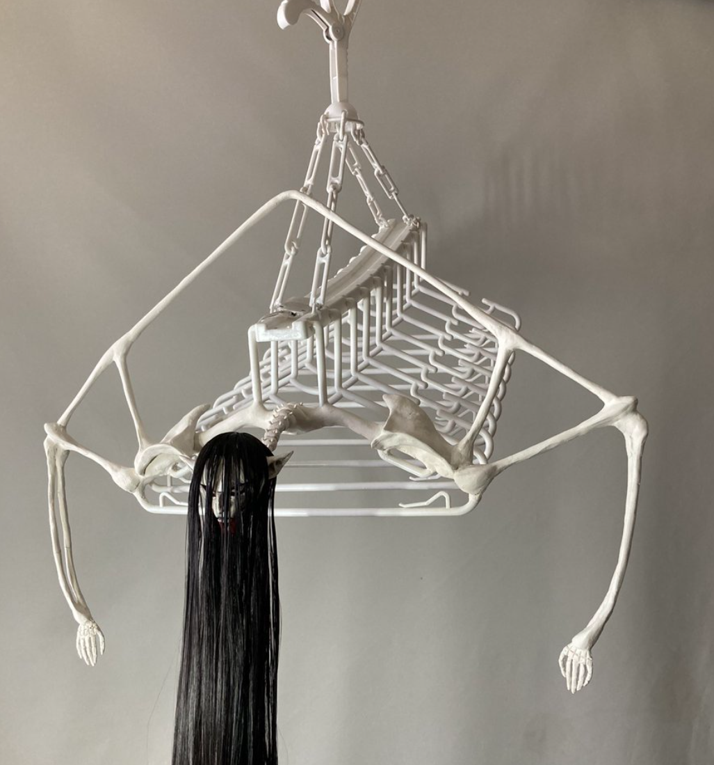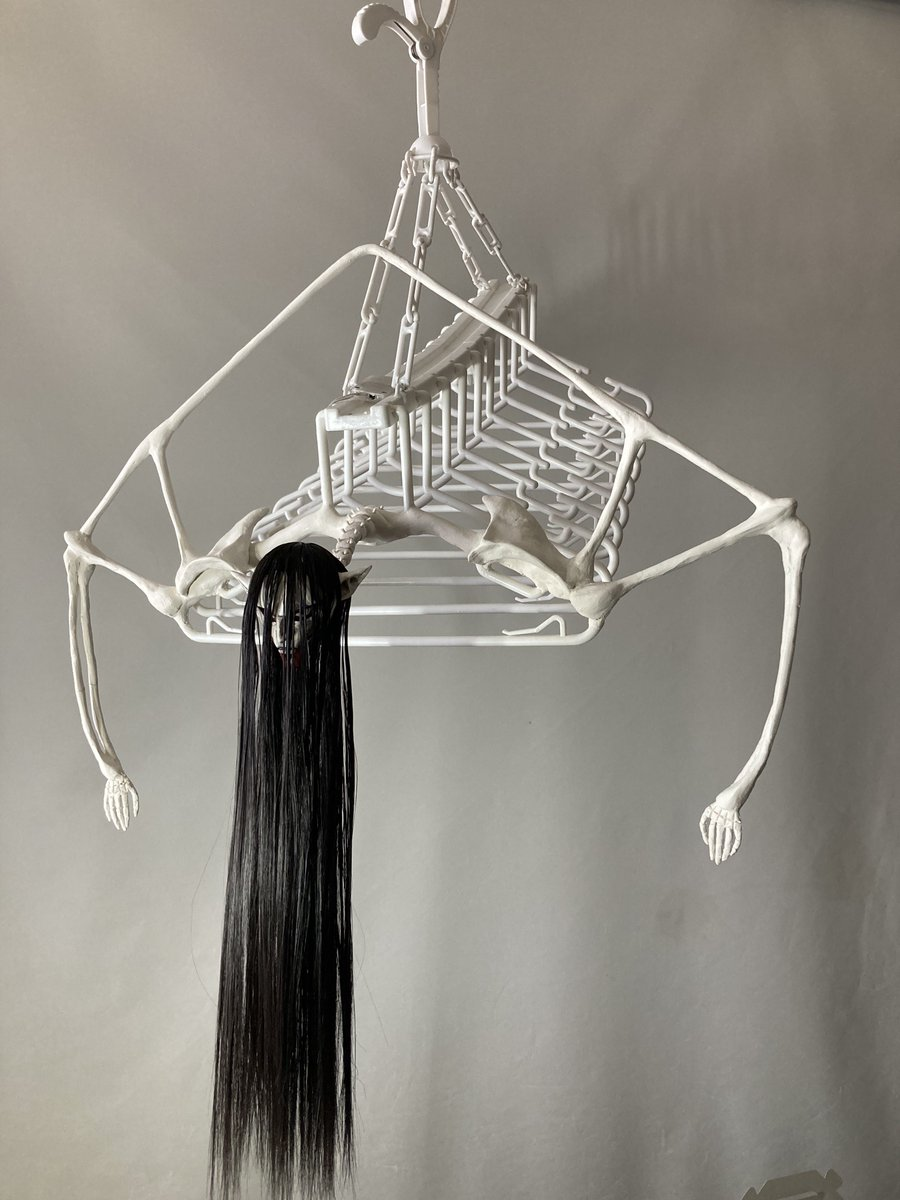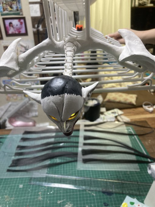這次「最終戰艾連曬衣架」以最終章的艾連為靈感,將原先吊掛的曬衣架組,加上自製的骨骼點綴,加上長髮的頭顱,整個氣氛呈現非常具有張力的樣貌,尤其如果吊掛在陽台上,鄰居應該看到會嚇死吧 www。