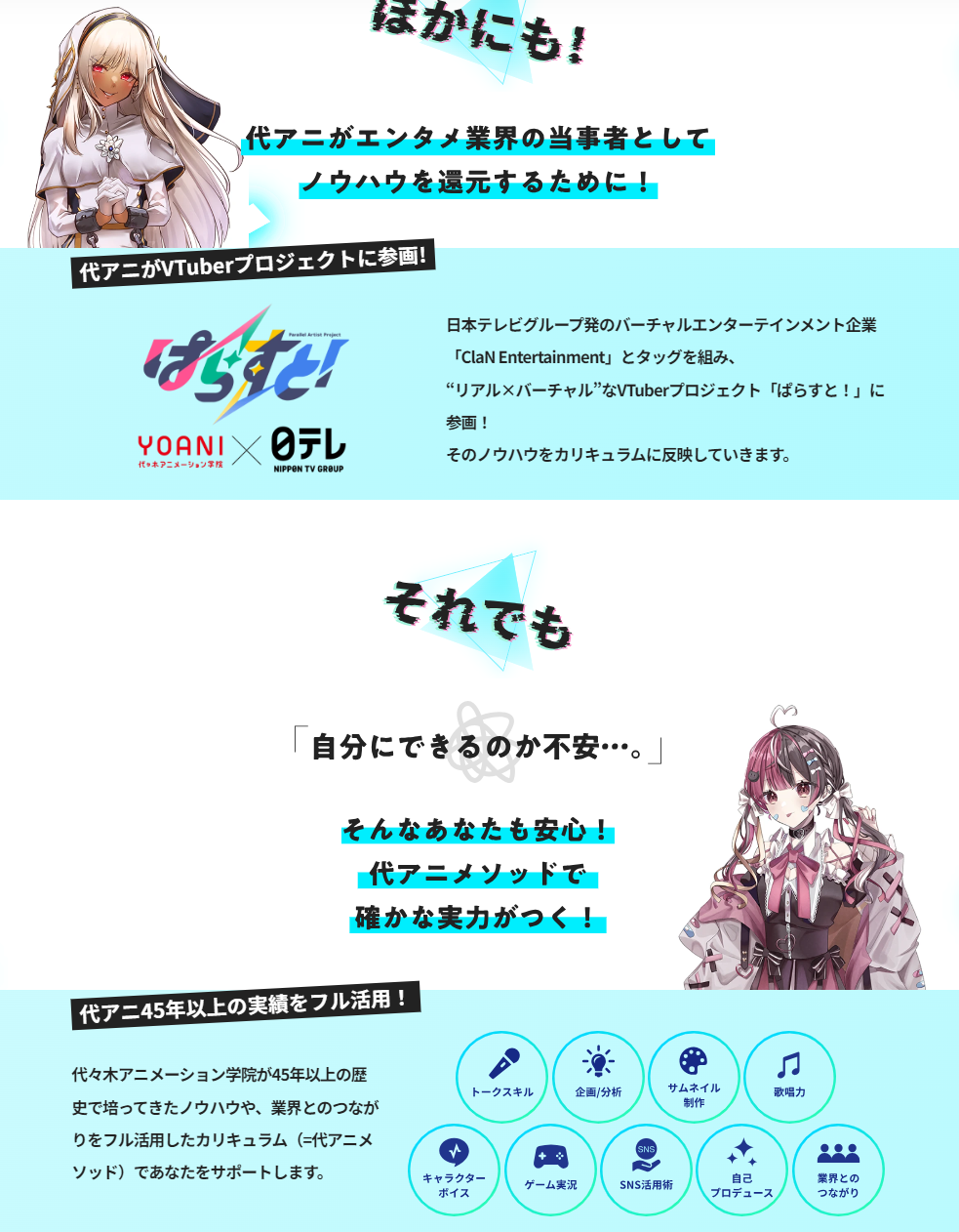 並結合代代木學院的長年課程編排,讓學生能夠實際參與企畫製作、歌曲訓練以及實況體驗,連社群經營、說話技巧以及聲音培訓都在其中,讓你知道 VTuber 不是只要套皮開台就能成功,背後的努力與訓練都是必須的。