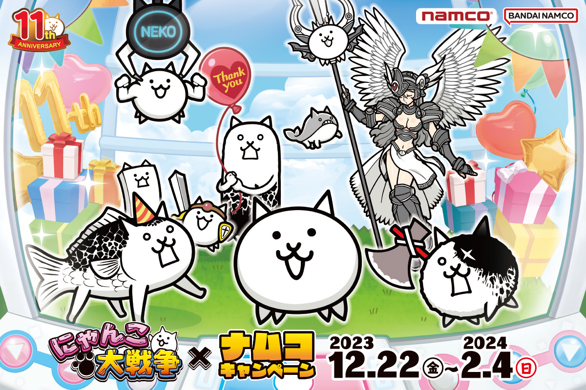 為慶祝人氣手機遊戲《貓咪大戰爭》迎來 11 周年紀念,日本萬代玩具公司特別推出『貓咪大戰爭 x NAMCO』合作活動,於 2023 年 12 月 22 日 ~ 2024 年 2 月 4 日,將在日本各大南夢宮直營遊樂設施以及線上娃娃機商城 Torumo 推出多款包含「超超大毛絨玩具」、「模型系列」「真・瓦爾基麗貓模型」等獨家景品!