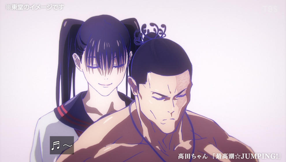而本次動畫演出上,在東堂全力開啟戰鬥模式時,當真人看到他的項鍊裏頭有虎杖跟小高田的照片時,出現了「東堂的想像」( 東堂のイメージ ) ,動畫讓東堂推的偶像「小高田」一起戰鬥,瞬間變成兩人組合讓真人吃足口頭,也讓網友大讚這效果簡直有如「領域展開」般帥氣。