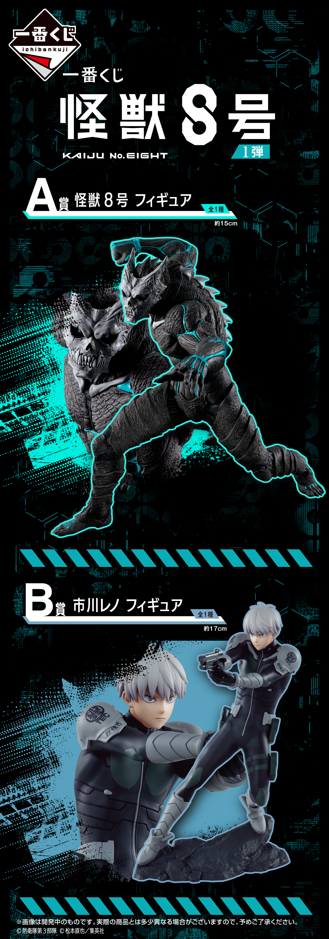 搶先發表的「一番賞 怪獸8號 1彈」,共推出 A ~ H 賞+最後獎、雙重中獎機會等豐富的獎品!目前公開有 A賞 「怪獸8號」、 B賞「市川雷諾」角色模型,以及 C 賞 「保科宗四郎大型壓克力立牌」、D賞 「四之宮琪歌露大型壓克力立牌」,還有壓克力立牌、毛巾、資料夾貼紙套組、橡膠吊飾等豐富的獎品~