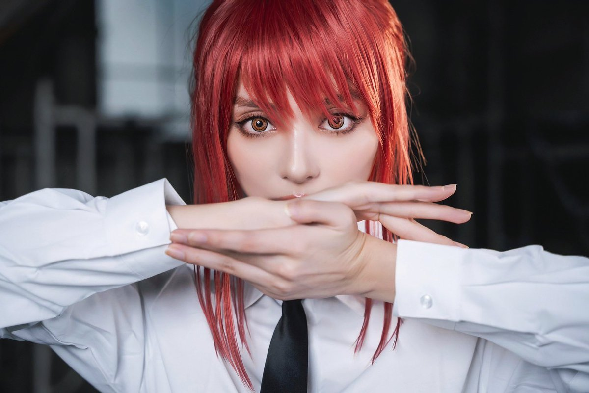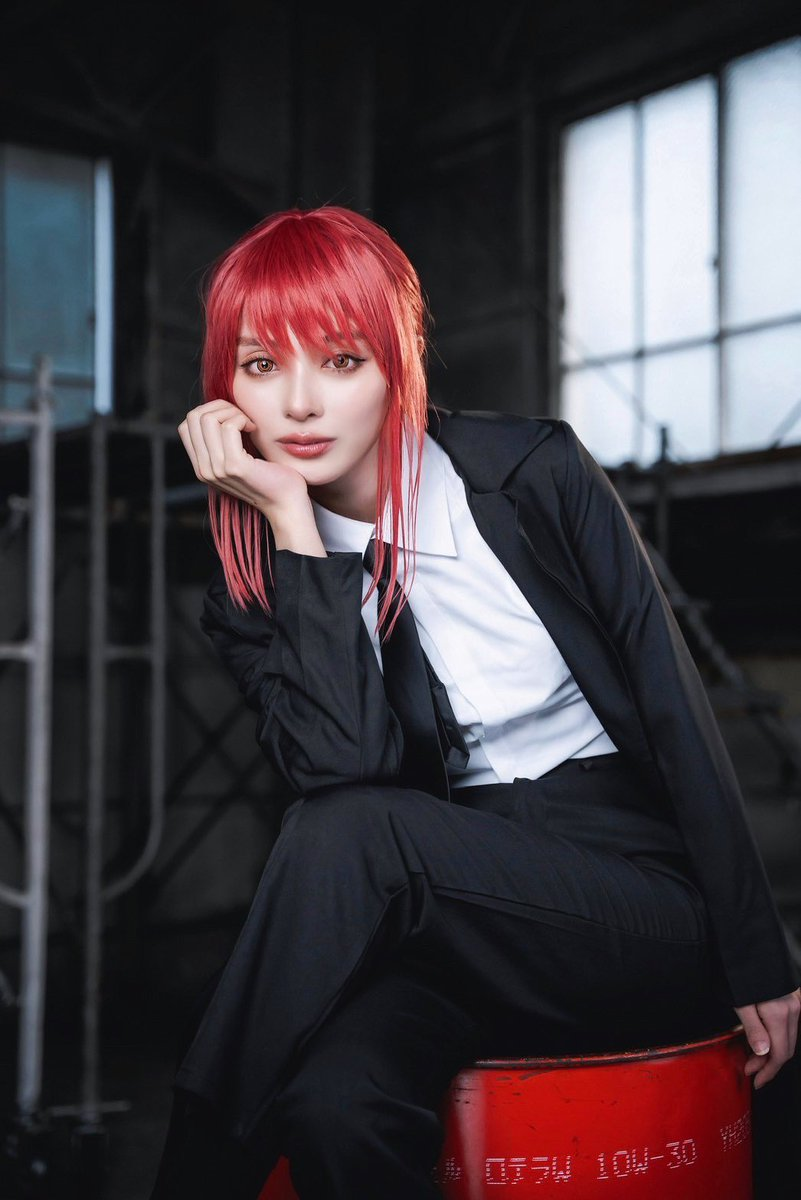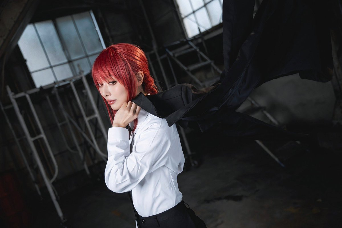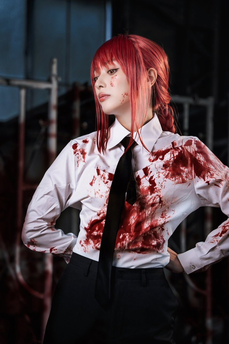 這次選擇Cos《鏈鋸人》真紀真,換上鮮紅色的假髮與變色片,搭配真紀真的領帶襯衫裝扮,加上招牌的手勢與內田里央精湛的眼神氣勢傳遞,真的給人壞女人的氛圍 XD。