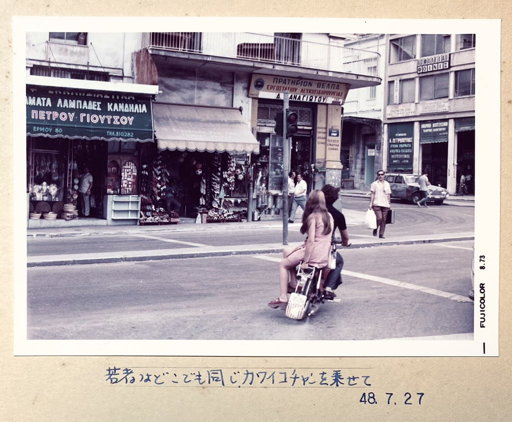 ▼還會像這樣為相片寫下圖說。「不管在哪年輕人都會像這樣載著年輕女孩。」(昭和48年剛好就是五十年前(1973年))