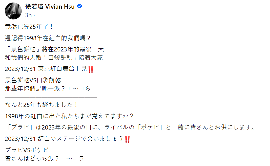 其中身為「黑色餅乾」台灣成員徐若瑄也在 Facebook 上宣布消息,自己上一次登上紅白舞台已經是 1998 年的事情了,沒想到這次居然還可以跟團員一起重返紅白,還是跟昔日對手口袋餅乾一起,也邀請大家一起收看節目,一起度過 2023 年的最後一天。