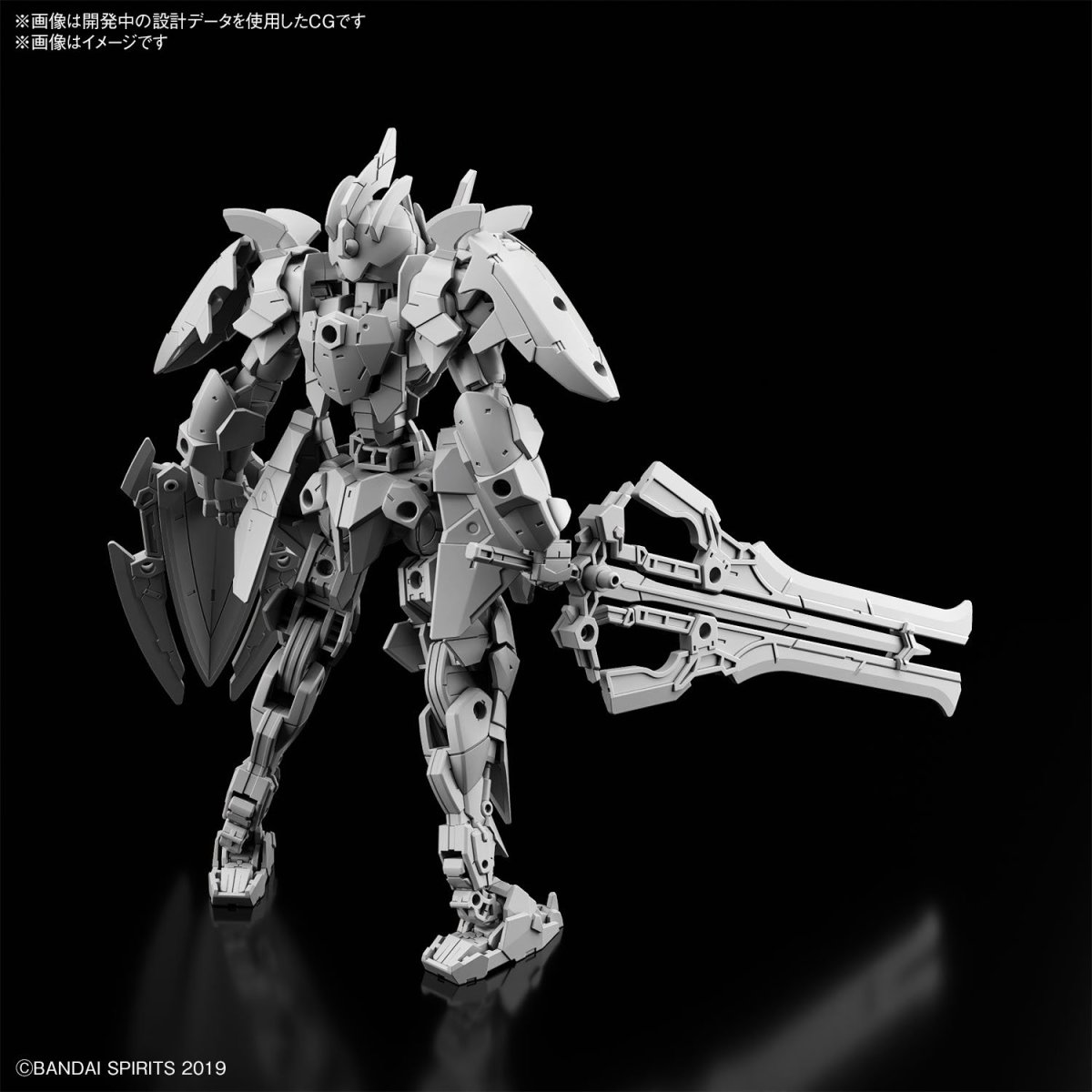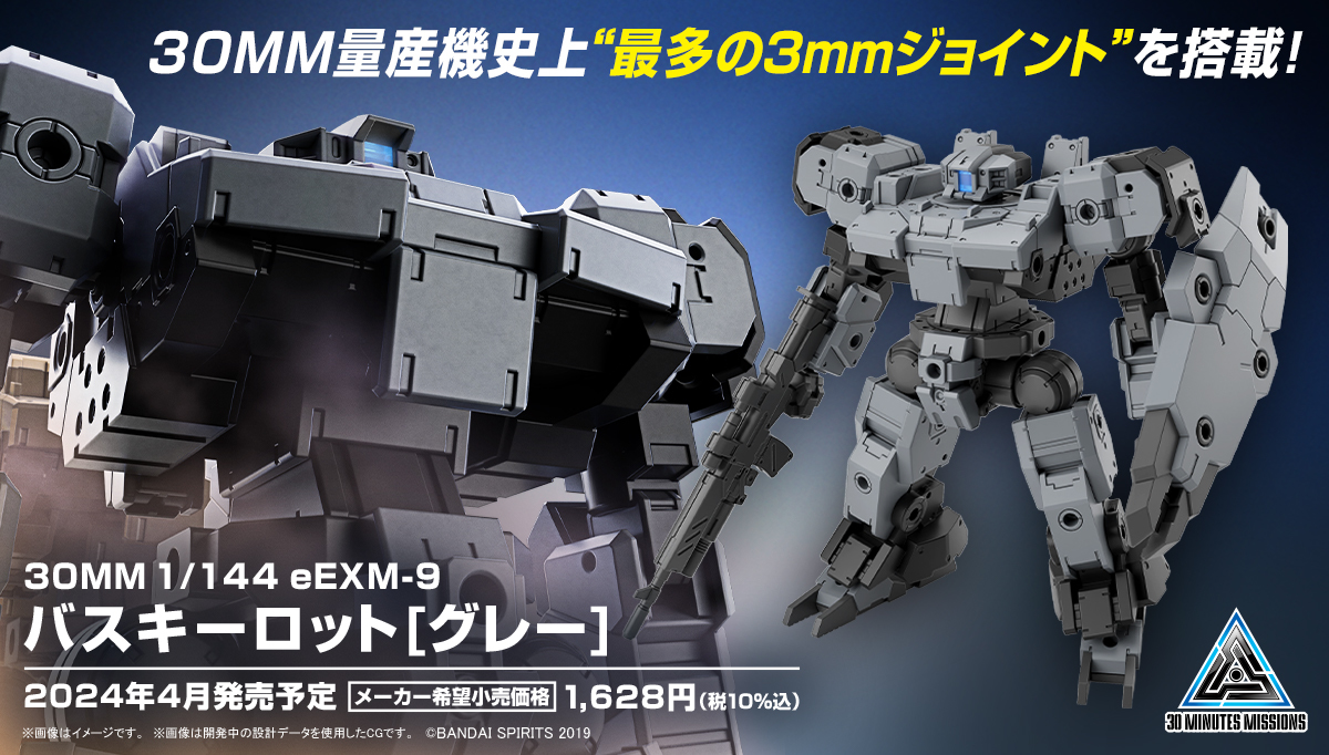 預計於 2024 年 04 月發售的新商品「30MM 1/144 eEXM-9 バスキーロット[灰色]」擁有寬大厚重的機身與重裝甲造型,配備步槍與盾牌等武裝,其最大特色是 30MM 量產機使用搭載最多 3mm 擴充孔的機體。