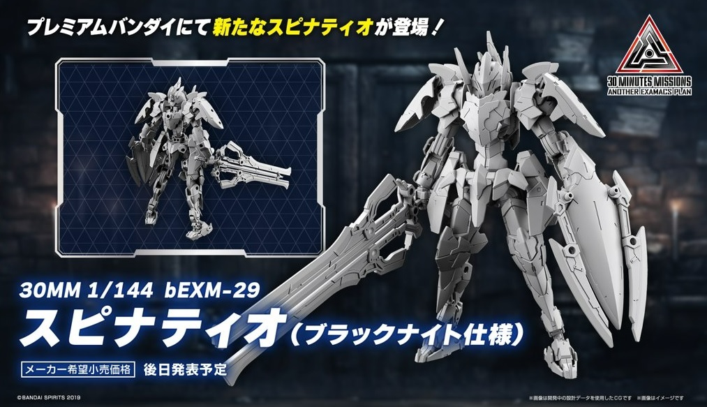 這架開發中的「司比納帝歐 (黑騎士規格)」是預計在 PREMIUM BANDAI 限定販售的『ANOTHER EXAMACS PLAN』王牌機體,造型基於過去發售的「司比納帝歐 (騎士規格)」修改而來,在頭部、雙肩、盾牌等多處增設更厚重的裝甲,並將長劍改裝為大劍。