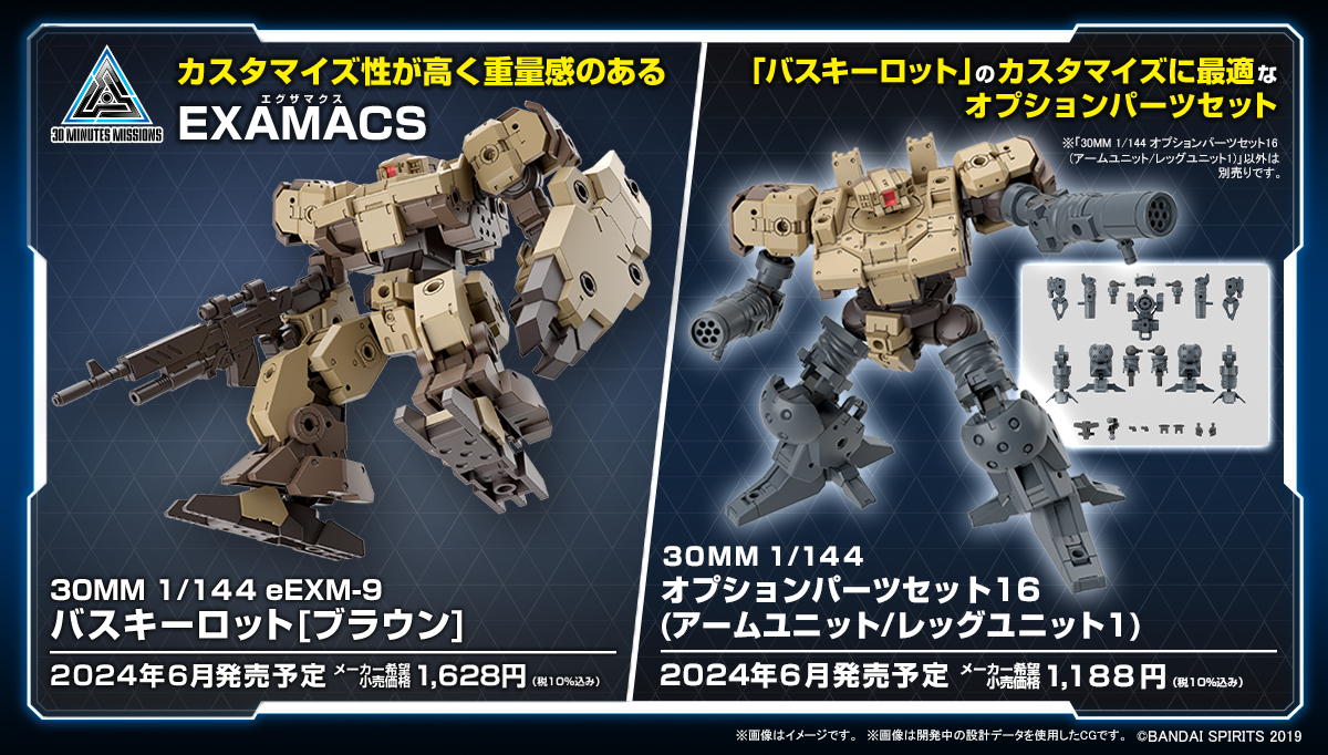 而預計於 2024 年 06 月發售的「30MM 1/144 eEXM-9 バスキーロット[ブラウン]」則是採用土色、棕色成形零件的沙漠迷彩配色,機體造型與結構和灰色機相同,擁有 30MM 量產機史上最多的 3mm 擴充孔。