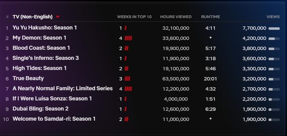 節錄自Netflix「2023年12月11日至2023年12月17日」的每週排名,真人影集《幽遊白書》以總觀看時間來到3210萬,擠下同樣當紅的熱門韓劇《與惡魔有約》(마이 데몬)、法國影集《血紅海岸》 (Blood Coast)...等,直攀非英語影集的週榜排名第一。
