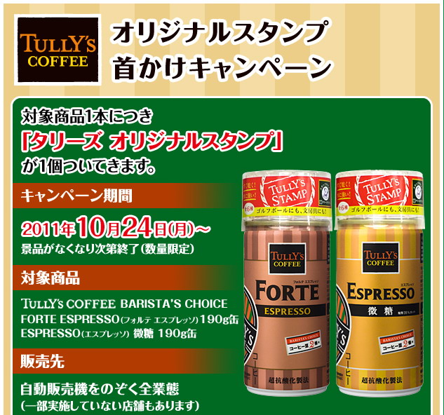 現在為您介紹的是日本伊藤園近日展開推廣「TULLY'S COFFEE」系列商品的行銷活動。隨罐附贈的是小熊、咖啡杯以及高爾夫球袋三種可愛造型的印章,而印章圖案又分6種圖案,所以要全部蒐集,恐怕有一陣子要失眠啦!因為是限量贈品,有看到別錯過!