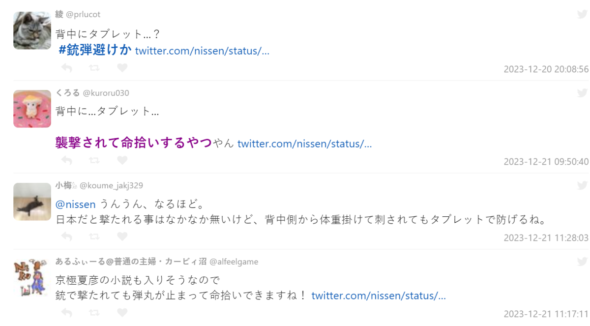 不過背部有口袋還可以放入平板這種宣傳,卻讓不少網友感到驚訝,畢竟這種地方放東西,到底是怎麼發想出來的。就有網友開玩笑說,這應該是可以當作防彈功能,很多電影或動畫都有類似的情節,放進去一個鐵板或是夠厚的東西,應該是能避免被襲擊,防彈或許言過其實,但擋刀或許是 OK 的。