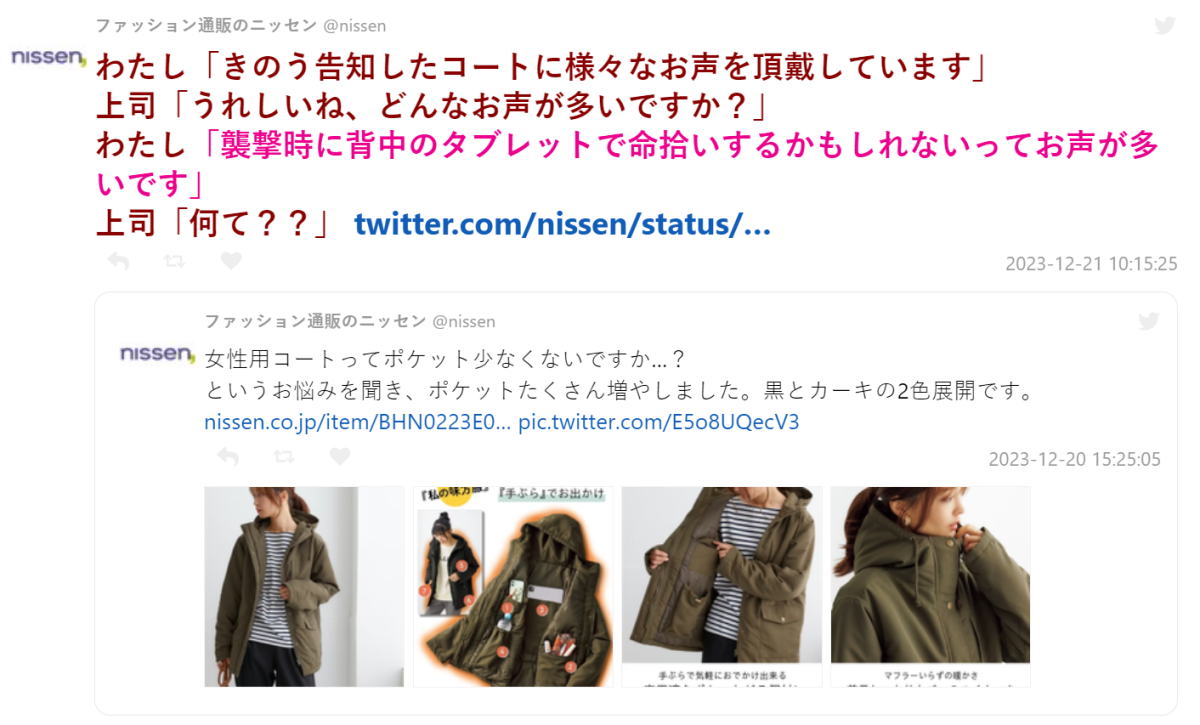 不過最近日本 X 上,有個服裝受到熱切討論,這是一家服飾通販廠牌 nissen 推出的「多口袋女裝外套」,標榜有著 7 個口袋處供你收納,讓外套儼然成為一個背包,卻因為示範中「背部口袋能放平板」引起熱議,到底在這裡放平板有何好處呢?