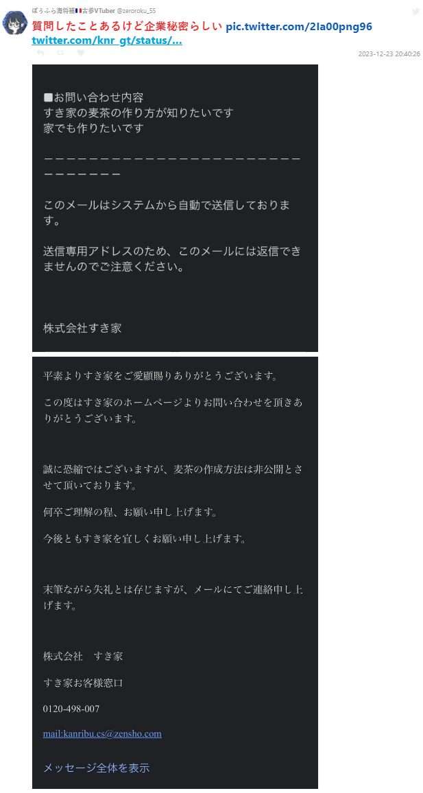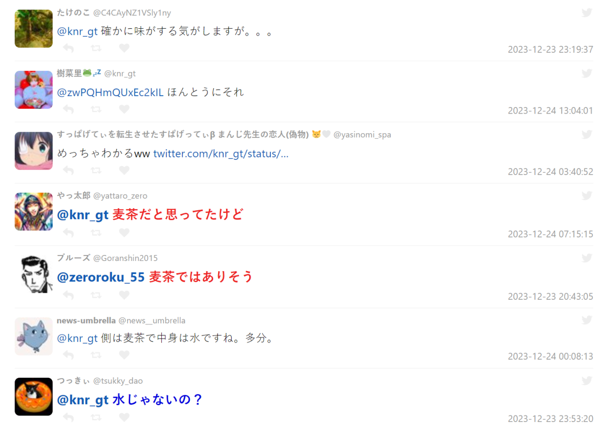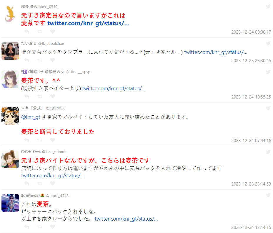 而有在すき屋工作的網友表示,確定那是麥茶沒錯,不過因為各店家可能調配的方式有差異,所以造成大家喝的感覺...不太一致,但可以確認的確是麥茶無誤。