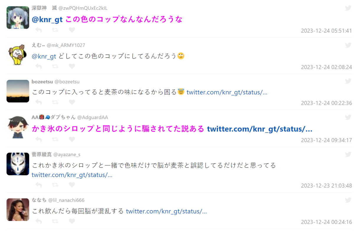亦有網友指出,因為提供的杯子是透明褐色的,感覺裡面就是麥茶 ( ? ) 裡面就算裝水也會覺得是茶,每次喝都有不同感受,腦袋很常打結混亂 www。