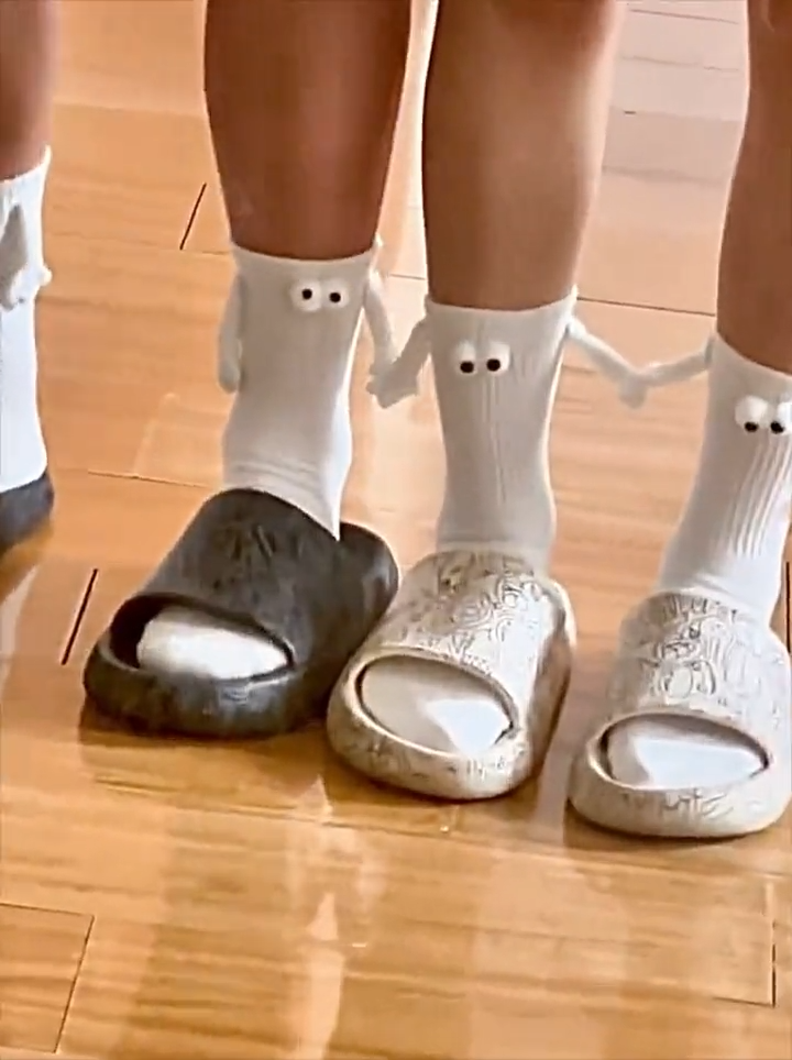 這是由最多情報局(@tyomateee)在Twitter(現稱X)上所分享的趣味影片,從內容中可以看到這雙襪子,上頭不只是個別有雙可愛的生動眼睛,在襪子的兩側還長出一對雙手,而有趣的就在這裡了,這兩隻手由於裡面還藏著小型的磁鐵,因此一旦靠近,襪子之間就會將手緊緊牽在一起。