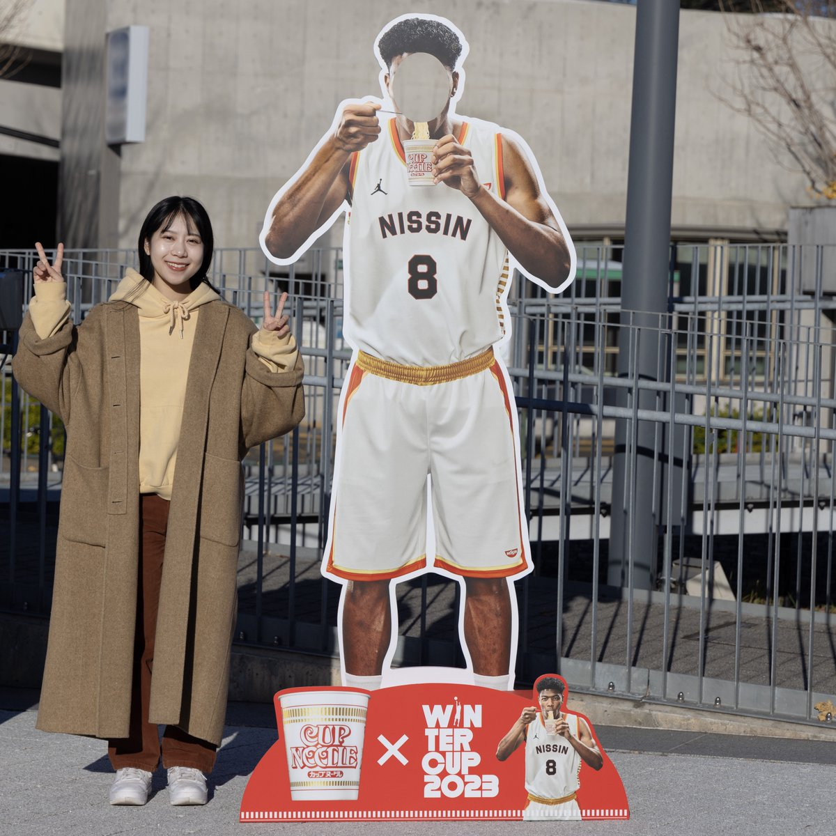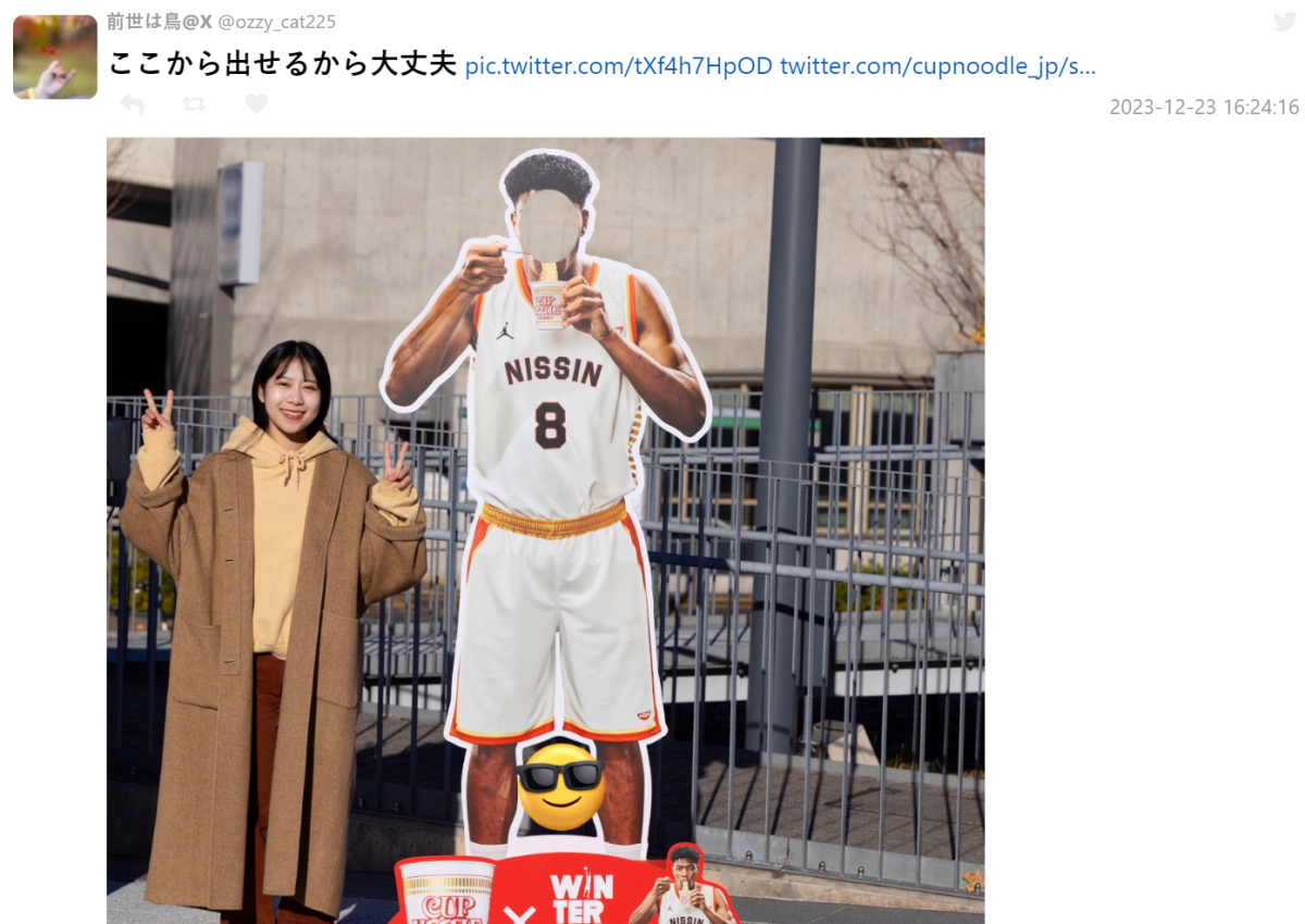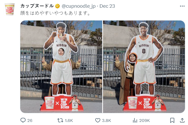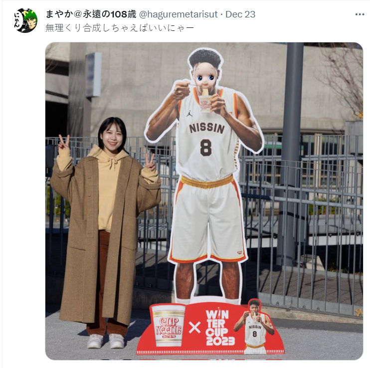 最近官方又有奇怪的東西,日清在高校籃球賽事「SoftBank Winter Cup 2023」會場擺設旅美日籍球星-八村壘的一比一人型看板,還特別挖洞讓民眾把臉可以套上去,這壞心眼的設計也引起網友熱議。