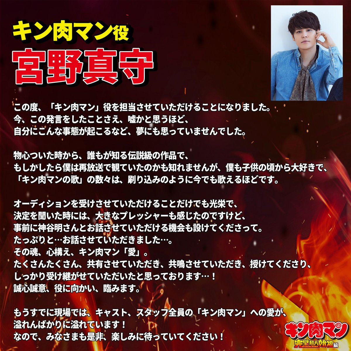 宮野真守表示,《金肉人》對大家來說是家喻戶曉的傳說級作品,自己從小就很喜歡,甚至對「金肉人之歌」更是朗朗上口。當初受邀試鏡就感到光榮,沒想到確定由自己演出,跟和前輩神谷明聊過,感受到對作品無比的愛,也希望這次演出能讓大家滿意,獻給所有喜歡金肉人的粉絲。