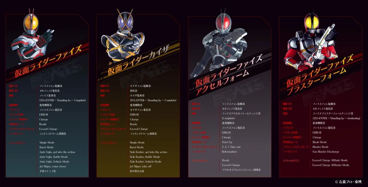 另外,最值得一提的就是收藏的提示語音系統,包含 : 假面騎士Faiz、假面騎士Kaixa、以及假面騎士Faiz 加速形態跟爆發形態的語音,四種共計有 59 個特製語音,讓你身處 555 的世界裡聆聽音樂。
