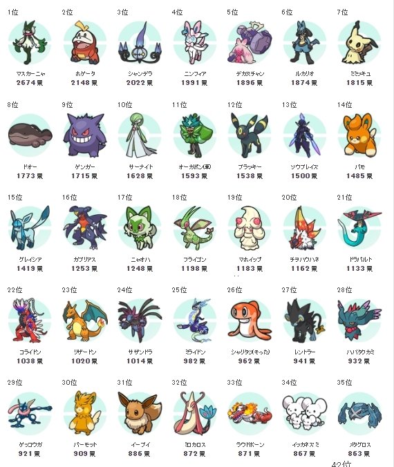 不僅魔幻假面喵、呆火鱷依然穩坐在前5名的位置,就連首度在《寶可夢 朱/紫 零之秘寶》「前篇:碧之假面」登場的「鬼」厄鬼椪,也憑藉著高人氣,進入前15名的榜單中。至於不論在對戰,還是外表可愛的謎擬Q、耿鬼,不只依然穩定在前10名內,甚至名次還比去年更往前一點。