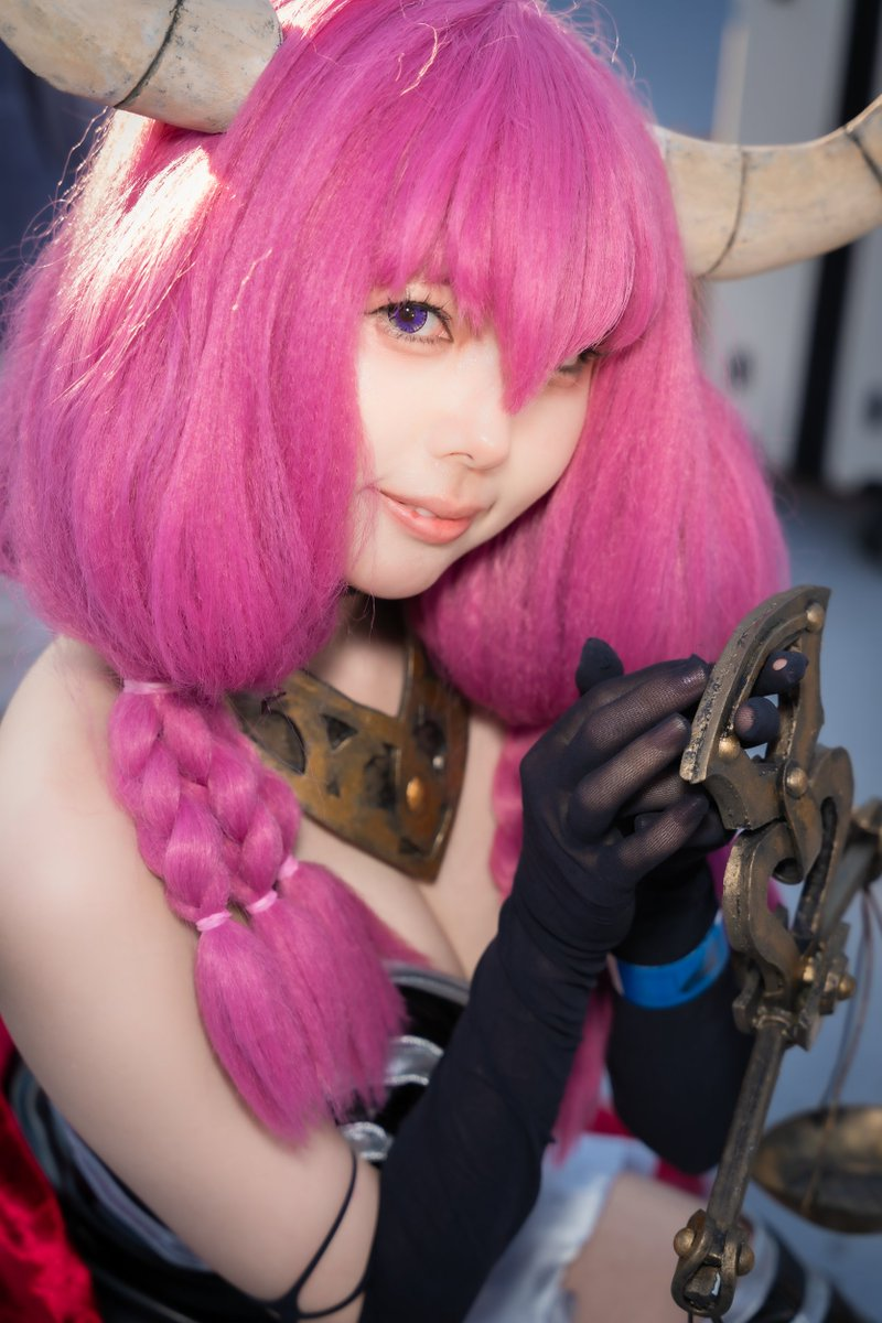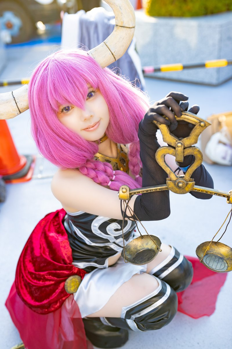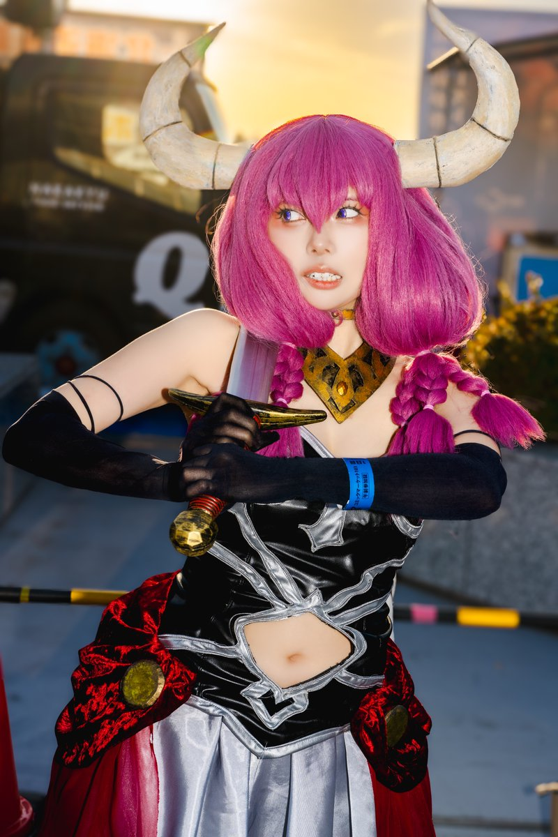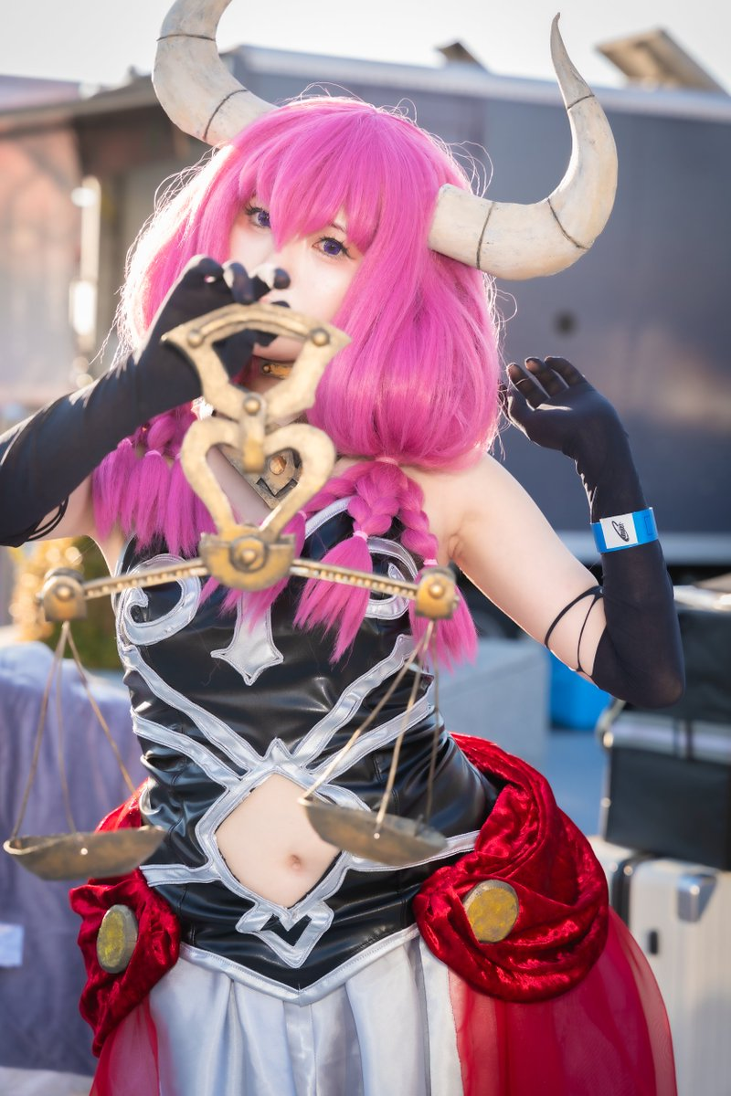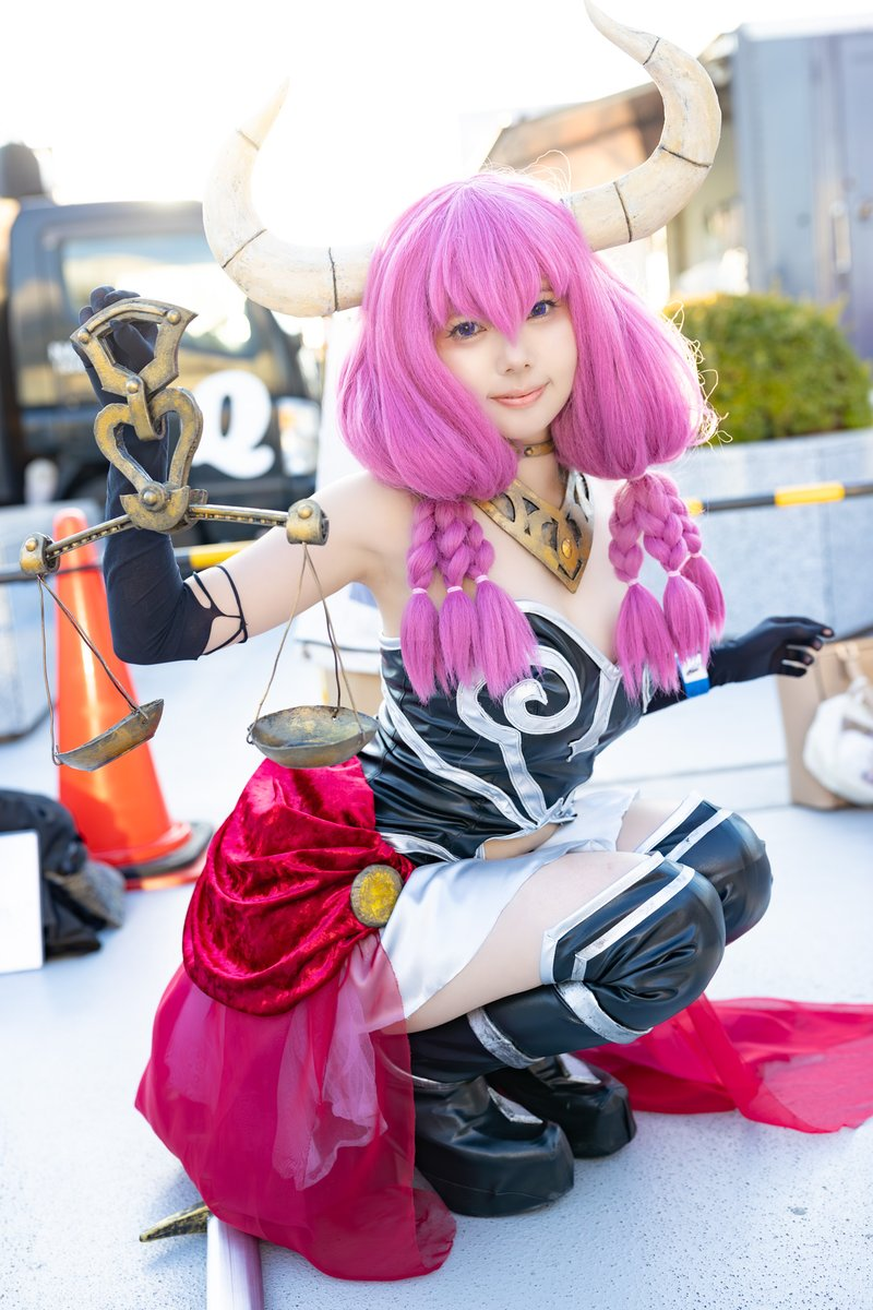 トキワ選擇阿烏拉來嘗試,也是因為自己在《葬送的芙莉蓮》 非常喜歡這個角色,決定換上紫紅色的頭髮,並還原阿烏拉的魔族戰鬥服裝與尖角,手持天秤與戰刀輔助,用心程度滿分 !