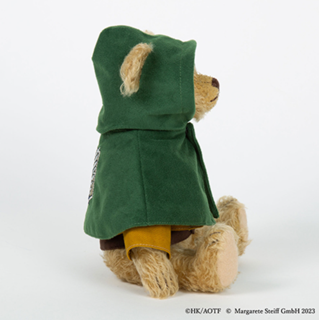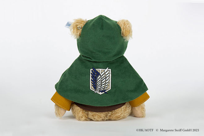 這次推出的「艾連泰迪熊」將調查軍團的制服以及綠色斗篷都完整製作出來,以經典的泰迪熊毛色呈現。除了屬於 Steiff 經典商標的「金耳釦」標章配置在左耳外,更附有「進擊的巨人動畫 10 周年的勳章」,更具特別意義。