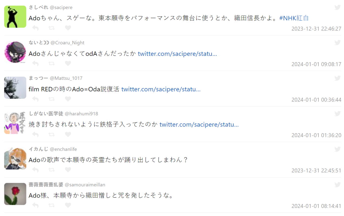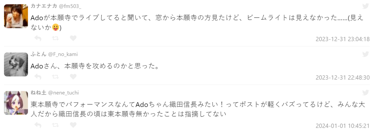 而 Ado 演出選擇了東本願寺,也讓網友開玩笑說根本是織田信長,不知道她的歌聲是否能喚起本願寺的英靈 ( ? )